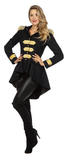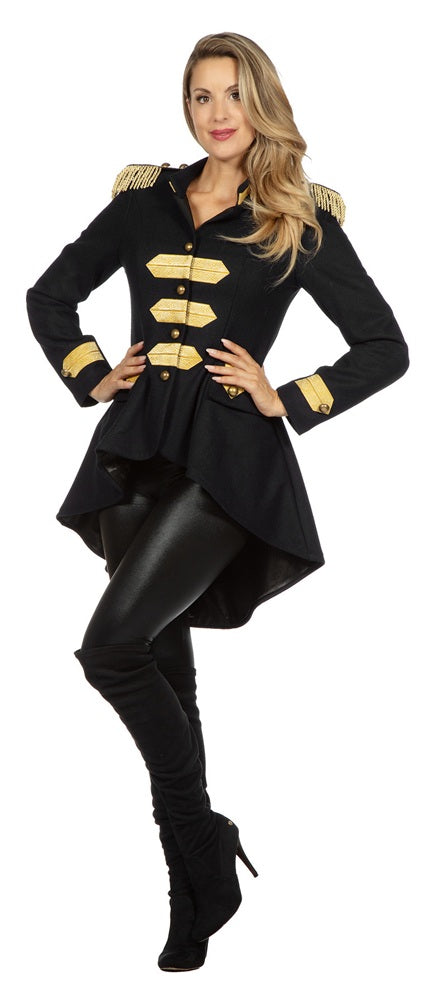 Der taillierte Damen-Frack Frank ist die perfekte Wahl für alle, die einen auffälligen, stilvollen Show-Look suchen. In edlem Schwarz gehalten und mit goldenen Epauletten verziert, vereint dieser Frack Eleganz, Glamour und eine Prise Zirkus-Magie. Die figurbetonte Passform betont die Taille und sorgt für einen selbstbewussten Auftritt.