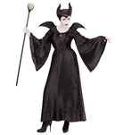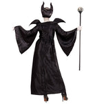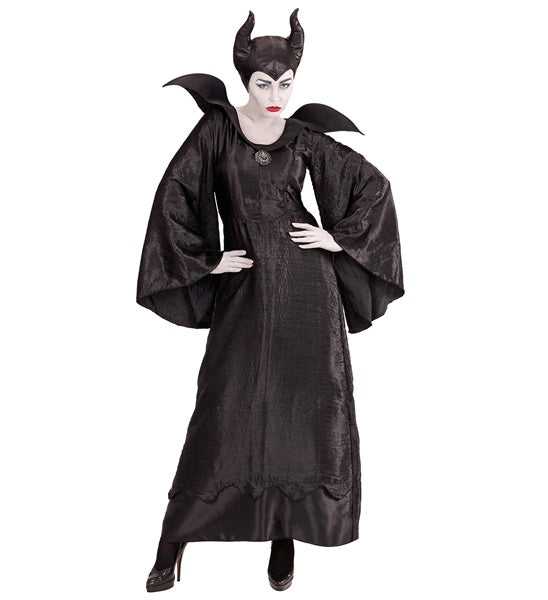 Das bodenlange schwarze Kleid aus glänzendem Stoff betont die Silhouette und sorgt mit seinen dramatisch weiten Ärmeln und dem hohen, spitz zulaufenden Kragen für einen majestätischen Auftritt. Der dazugehörige Hornkopfschmuck rundet das Outfit perfekt ab und macht dich zur unangefochtenen Königin der Schatten.