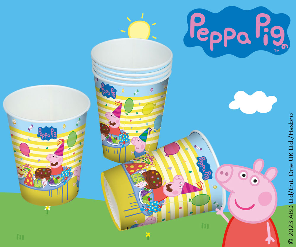 Was für ein fröhliches Fest! Peppa Wutz und all ihre Freunde sind gekommen, um mit einem tollen Picknick deinen Geburtstag zu feiern. Mit Geschenken, Geburtstagstorte und bunter Partydeko warten sie schon auf dich auf der Wiese. Die 6 Peppa Wutz Party Becher sorgen für gute Laune und auf jedem Kindergeburtstag. In die Becher passen 200ml Getränke.