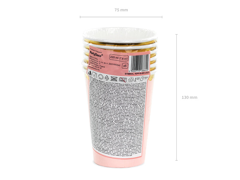 Nach vielen Leckereien auf der Party bekommt man ganz schön Durst. Unsere Candy Party Pappbecher in Hellrosa sind perfekt, um gemeinsam anzustoßen oder den Durst deiner Gäste zu löschen. Ihr edles Design erhalten sie durch den edlen, glänzenden Goldrand. Besonders beliebt sind sie auf Babypartys, Prinzessinnengeburtstagen oder wilden Junggesellinnenabschieden. Jeder der 6 Becher hat ein Fassungsvermögen von 220ml.