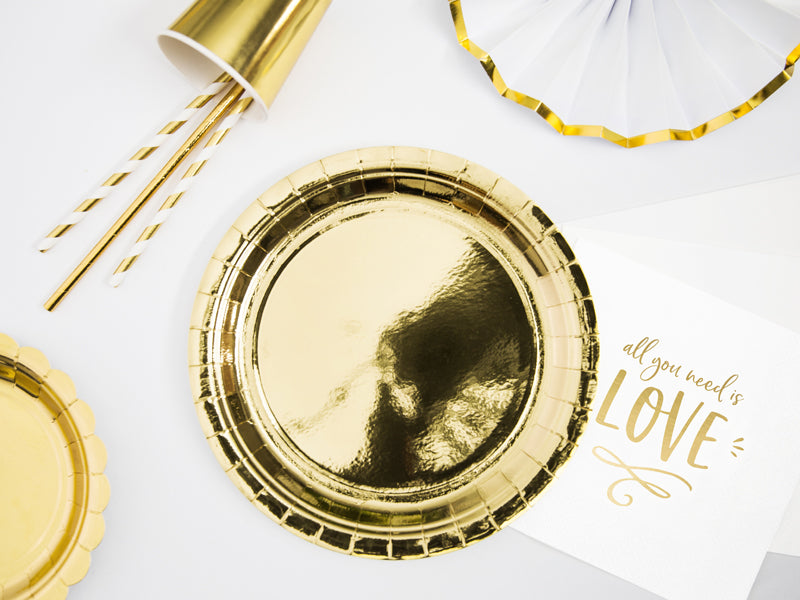 Diese 6 Gold metallic Pappteller haben einen Durchmesser von 23 cm und sind super einsetzbar für die verschiedensten Themenpartys, sei es ein Jubiläum, Geburtstag, Mottos wie Hollywood, Casino oder Silvester. Durch ihre glänzende Farbe veredeln sie einfach jede Tischdeko und machen deine Party zu etwas Besonderem.
