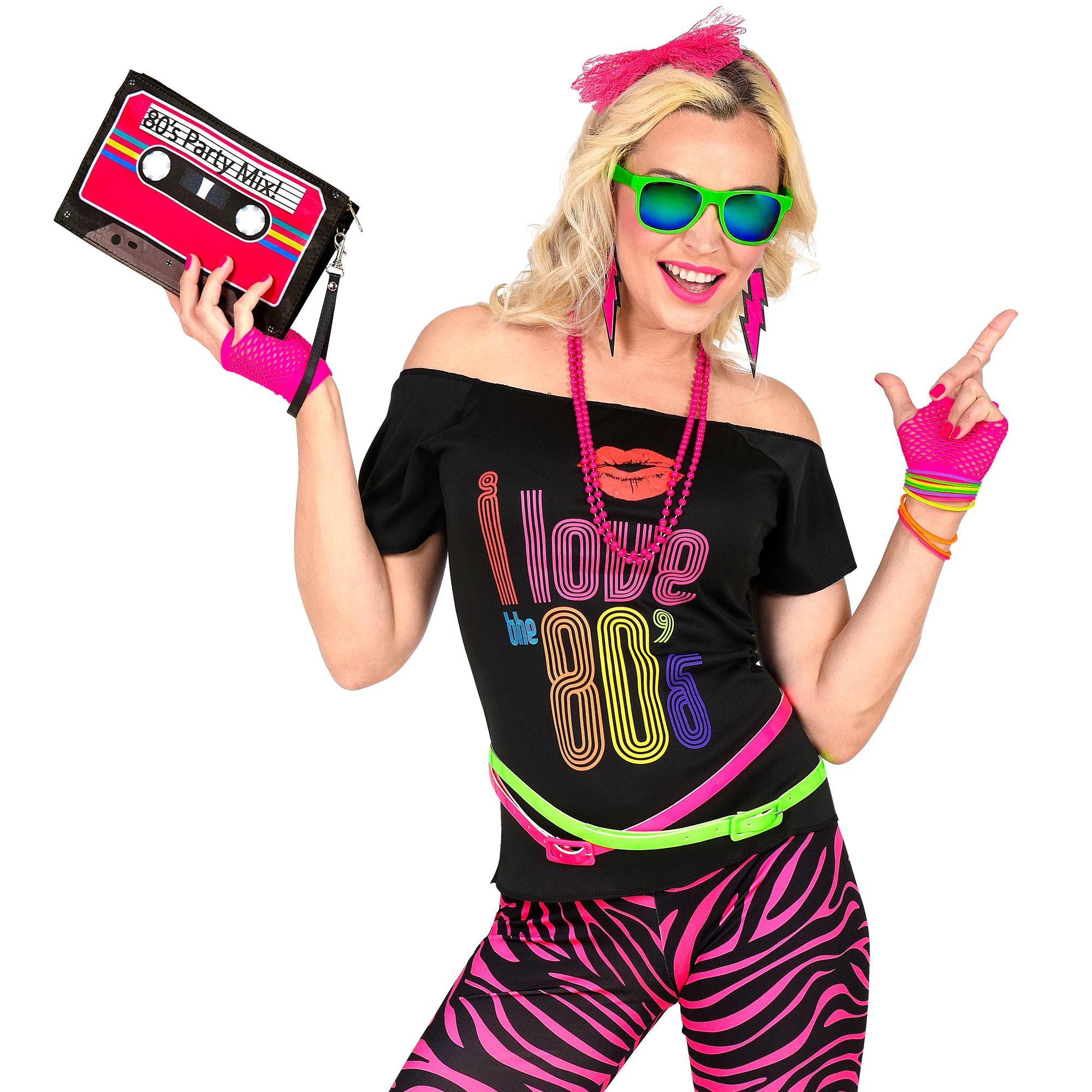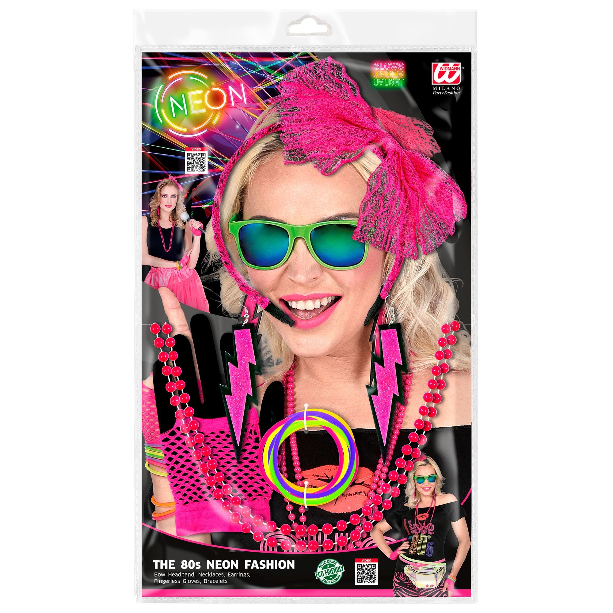 Das 80er Jahre Zubehör Set Neon Pink besteht aus einem Haarreif mit Schleife, einem Paar Ohrringe, 2 Perlenketten sowie einem Satz Armreifen und Netzhandschuhen.