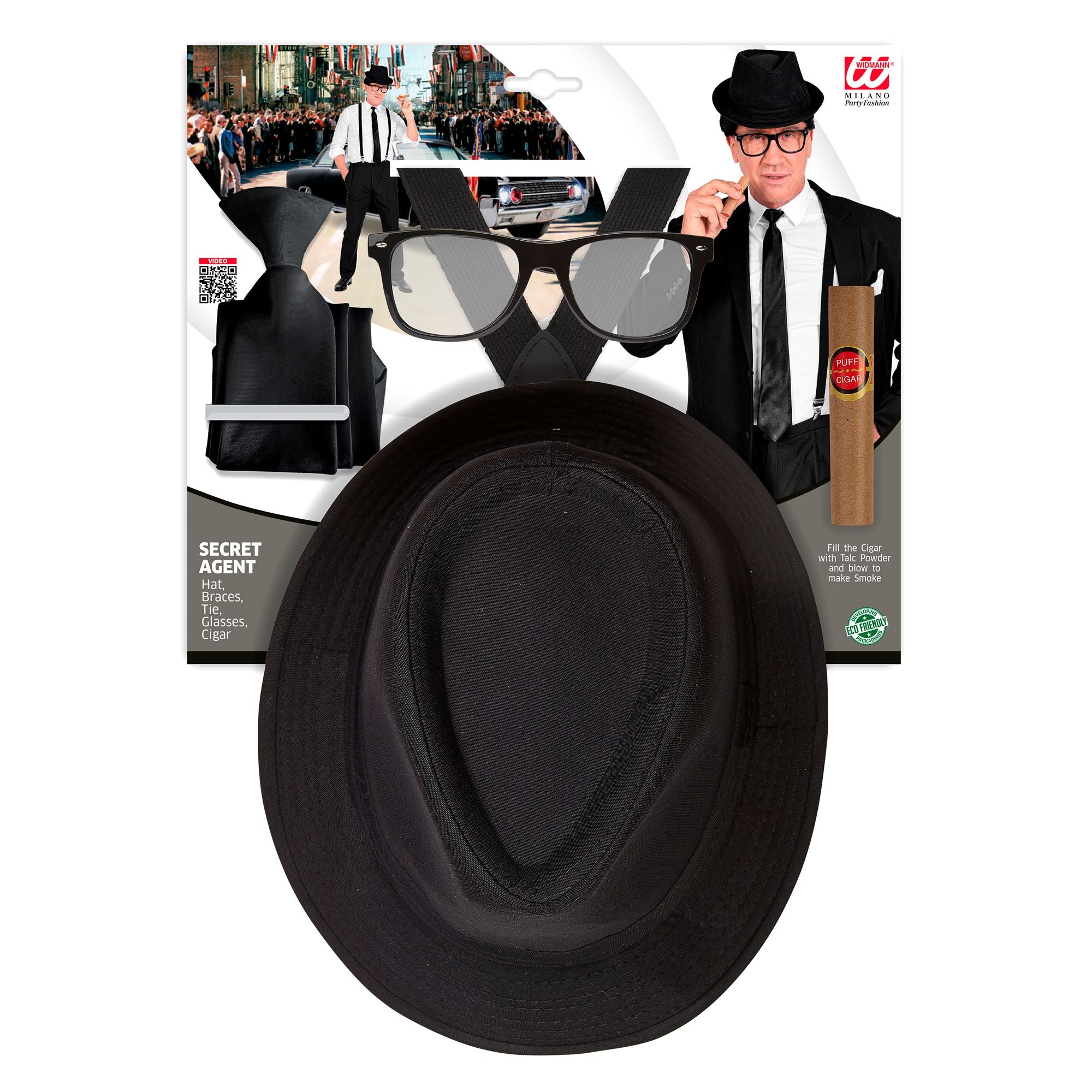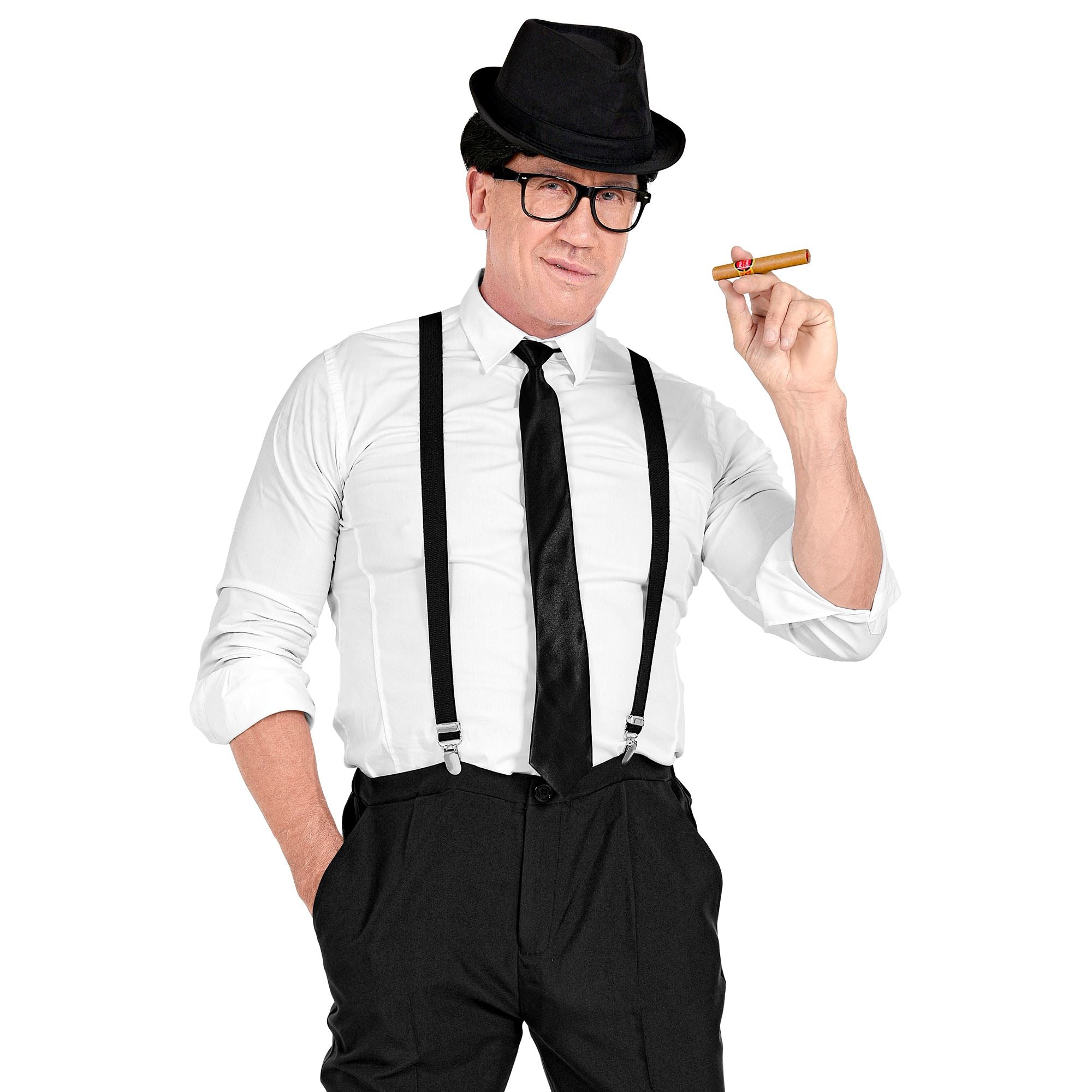 Ein schwarzer Anzug, dazu ein weißes Hemd und dieses 5-teilige Agenten-Accessoires-Set - fertig ist der kluge Kopf, der Verbrecher hinter Gitter bringt. Im Set enthalten sind ein schwarzer Hut, schwarze verstellbare Hosenträger, eine schwarze Krawatte sowie eine Brille und die obligatorische Zigarrenattrappe.