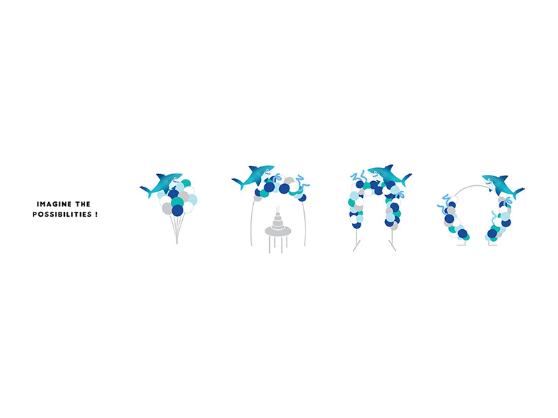 Das Ballongirlanden-Deko-Set Sharky besteht aus: 42x Latexballons in zwei Größen. 4x Modellierballon zum Darstellen von Wellen. 1x Folienballon in Haifisch Form. 30x Schaumstoffklebepads. 1x Papierstrohhalm und 2,5m Girlanden-Band.