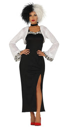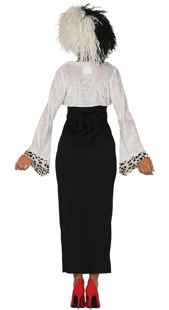 Das tolle Crystella Dalmatiner Fängerin Kostüm für Damen besteht aus einem figurbetonten langen Kleid mit hohem Schlitz sowie einer weißen Bolerojacke. Sowohl der Ausschnitt als auch die Ärmelenden sind mit einem Dalmatinerprint versehen. Eine tolle Kostümierung für viele Kostümveranstaltungen. Mit einer schwarz-weißen Perücke kann das Cruella Kostüm vervollständigt werden.