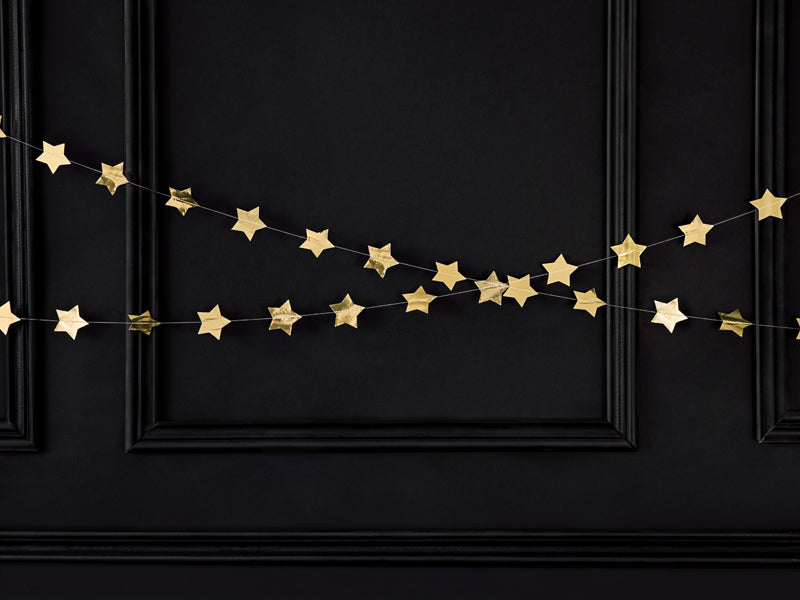 Die goldene metallic Sternen Girlande funkelt mit deiner Party-Location um die Wette! Dieser Hingucker passt zu unterschiedlichen Anlässen, wie z.B. zu Silvester oder zu einer Gartenparty an lauen Sommerabenden, aber natürlich auch zu Weihnachten. Die Sterne sind ca. 5cm groß und die Girlande ist insgesamt 3,6m lang.