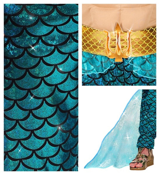 Herrsche über die sieben Weltmeere! Das Meeresgott Poseidon Herren Kostüm besteht aus einem muskelbepackten Oberteil mit goldenen Armbändern und einer Hose mit Gürtel und Tüllapplikationen, die an Schwimmflossen erinnern.