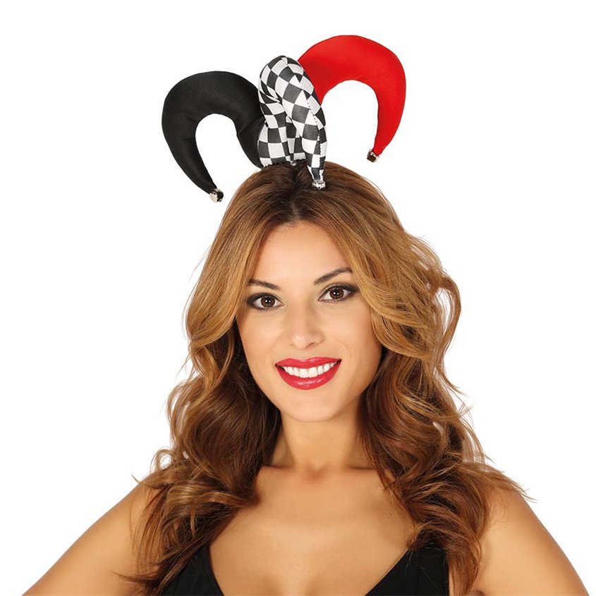 Der Mini Narrenhut Haarreif ist ein witziges Accessoire für viele Verkleidungen! Der kleine Harlekin Hut Pierrot sitzt auf einem schwarzen Haarreif und hält somit optimal auf dem Kopf.