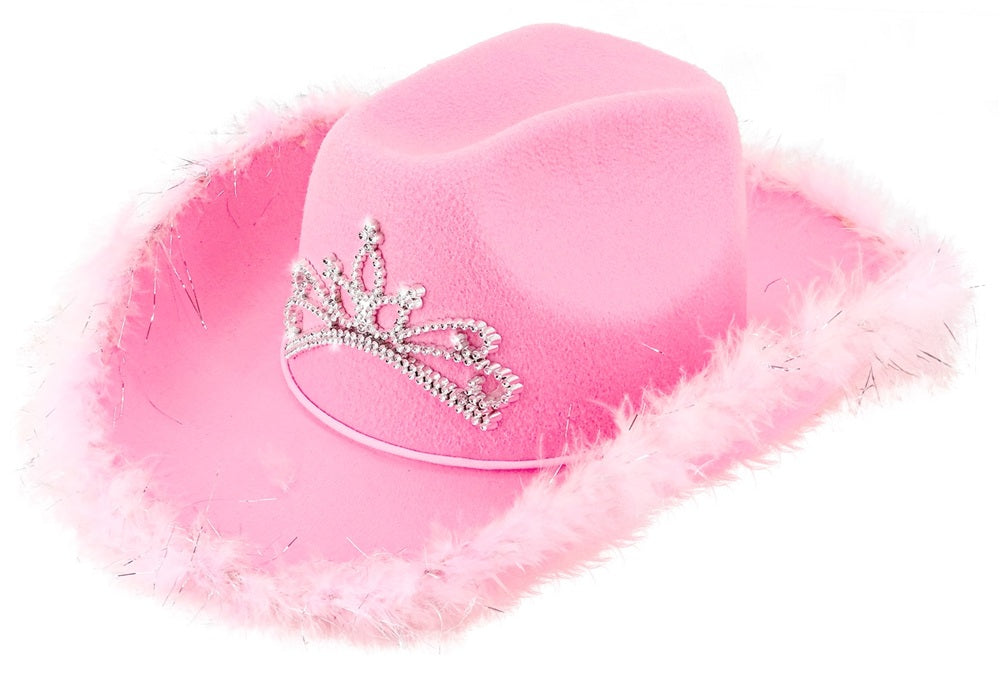 Rosa Cowgirl Hut mit Tiara und Marabu Verzierung