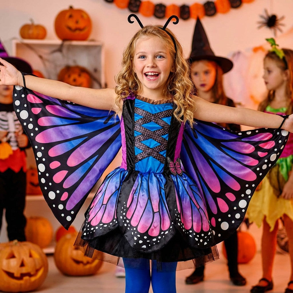 Was flattert denn da durch die Luft? Es ist Schmetterlings-Zeit! Das Schmetterling Kostüm Leya für Mädchen besteht aus einem lila-blau-schwarzen Kleid mit einem niedlichen Tüllrock sowie passenden weiten Schmetterlingsflügeln, die an der Hand fixiert werden können. Ein Haarreif mit niedliche Fühlern rundet das liebliche Outfit perfekt ab. Ein wunderschönes Styling für einen tollen Auftritt bei Kostüm-Partys, Fasching und Karneval.