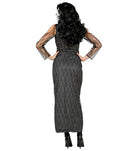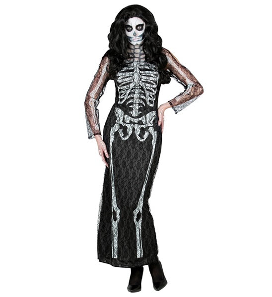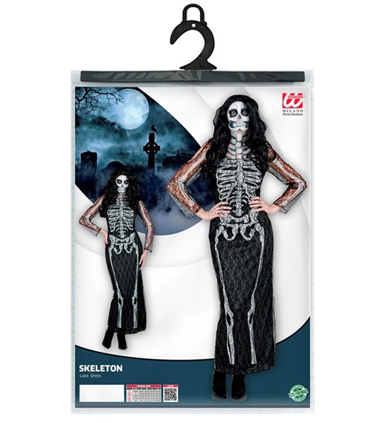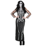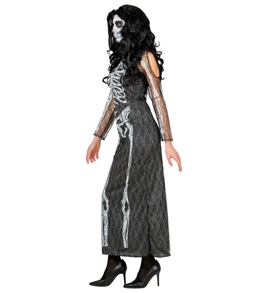 Das Lady Flordelis Damenkostüm eignet sich für Halloween oder den Tag der Toten gleichermaßen. Das schöne, lange Kleid mit schwarzer Spitze wird von einem aufgedruckten Skelett geziert.