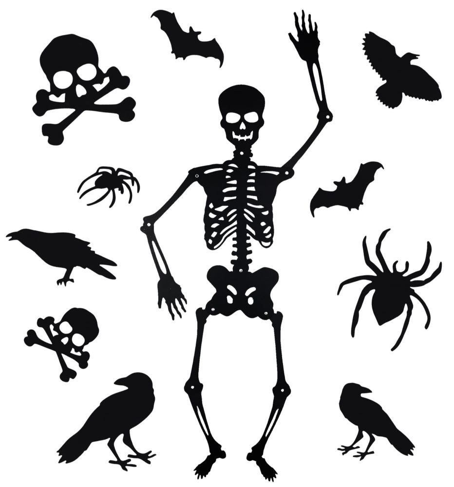 Skelettausschnitt hat bewegliche Gelenke. Das Dekorationsset enthält 10 zusätzliche Halloween-Ausschnitte. Größe 95cm