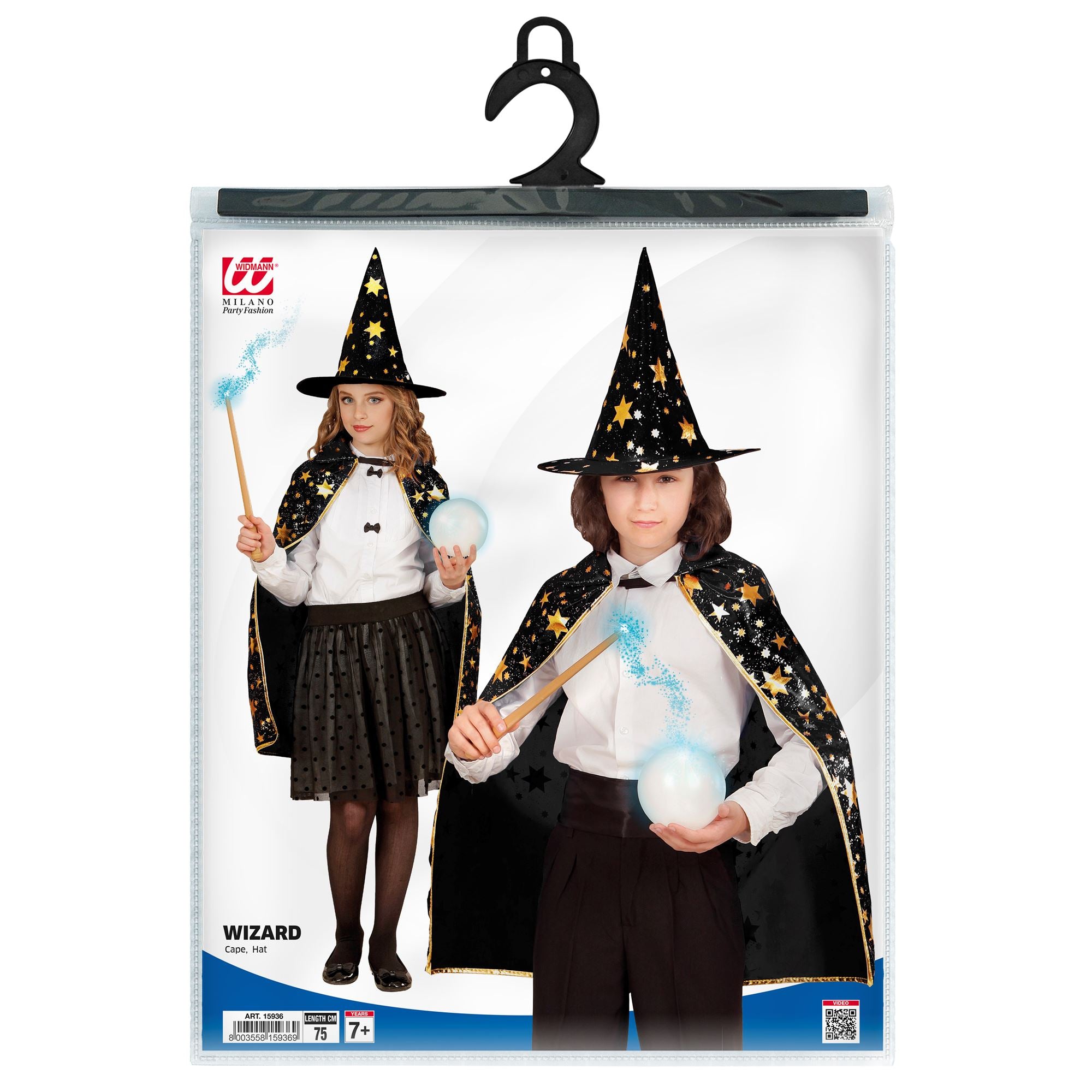Mit dem Sternenzauber Verkleidungsset für Kinder wird es magisch! Hut und Umhang sind beide schwarz und mit goldenen Sternen und Akzenten verziert. Du wirst also mit Leichtigkeit der Magier der Stunde.