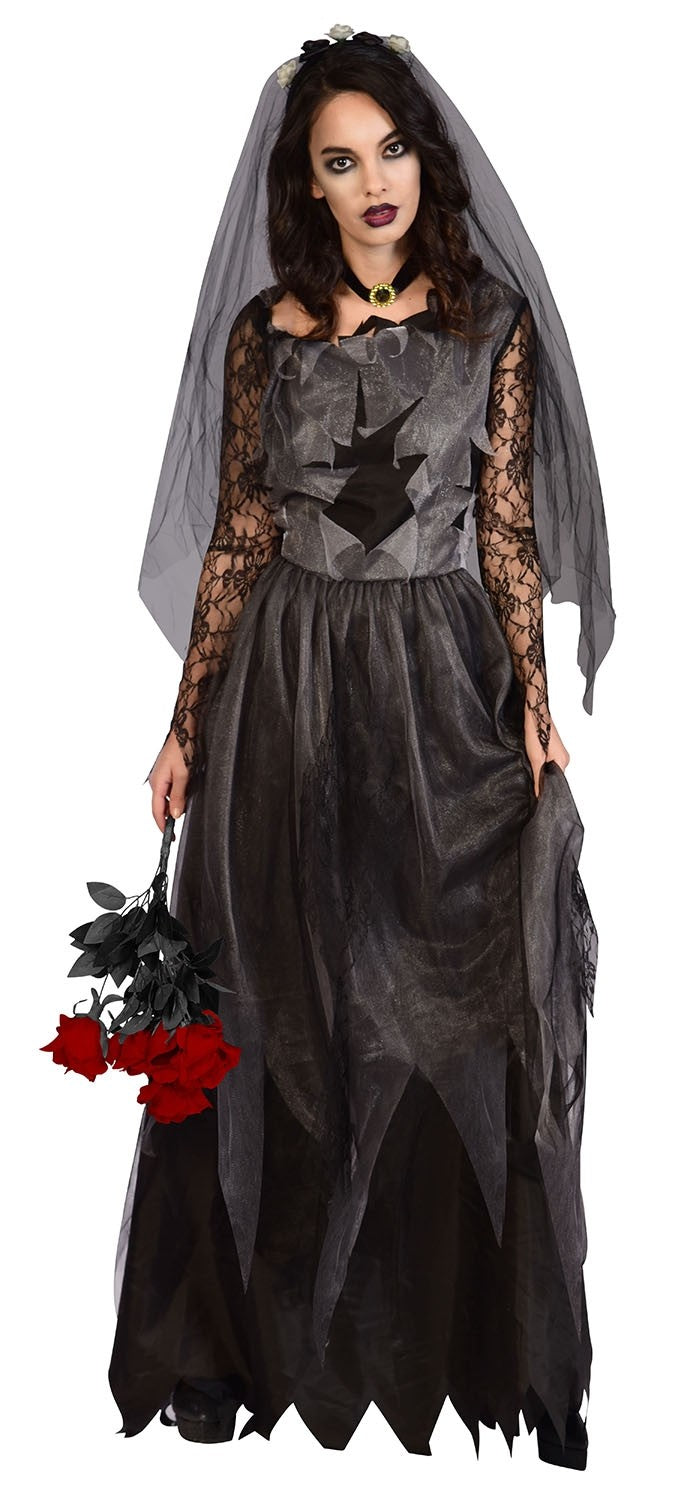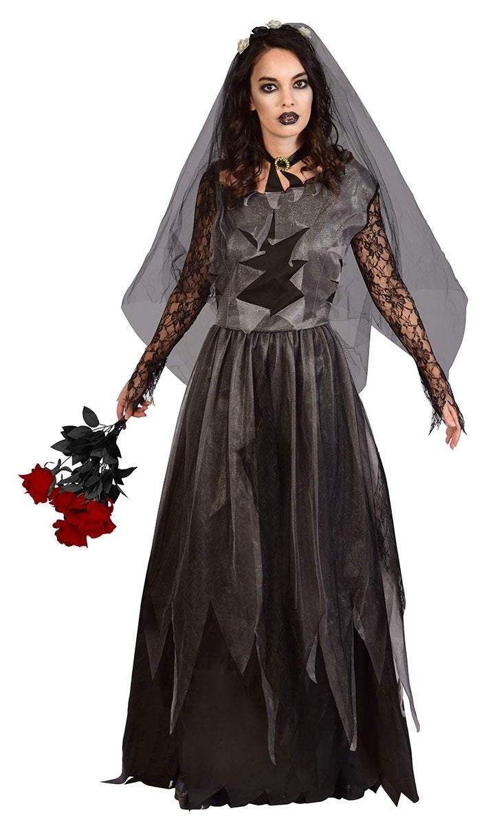 Das schaurige Totenbraut Lucia Damenkostüm besteht aus einem bodenlangen Fransenkleid mit Spitzenärmeln, einer Halskette sowie einem dunklen Schleier, der auf einem Haarreif befestigt ist. Jetzt noch ein schaurig schöner Blumenstrauß dazu und das Outfit ist perfekt um den auserwählten Zombiebräutigam zu heiraten.