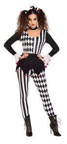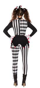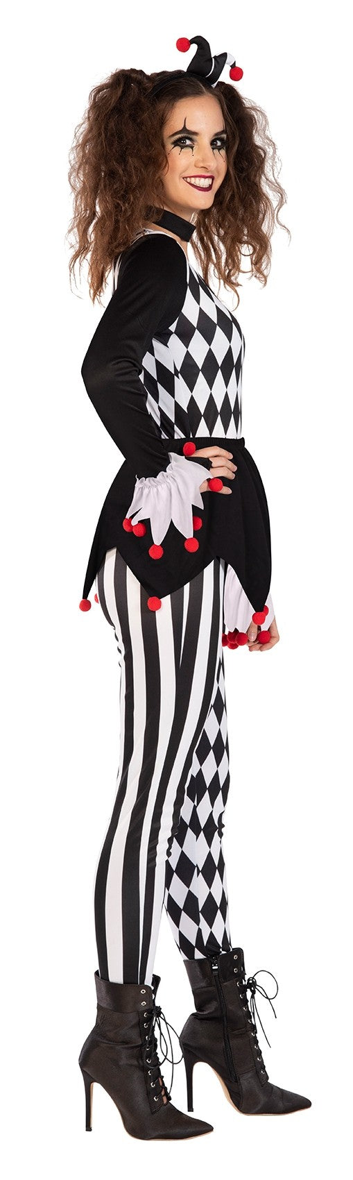 Das Närrin Damen Kostüm Deluxe, welches aus einem gestreiften Jumpsuit besteht, ist die perfekte Kostümierung für den Besuch der nächsten Halloween-Party. Die Halskette ist im Lieferumfang ebenfalls enthalten.