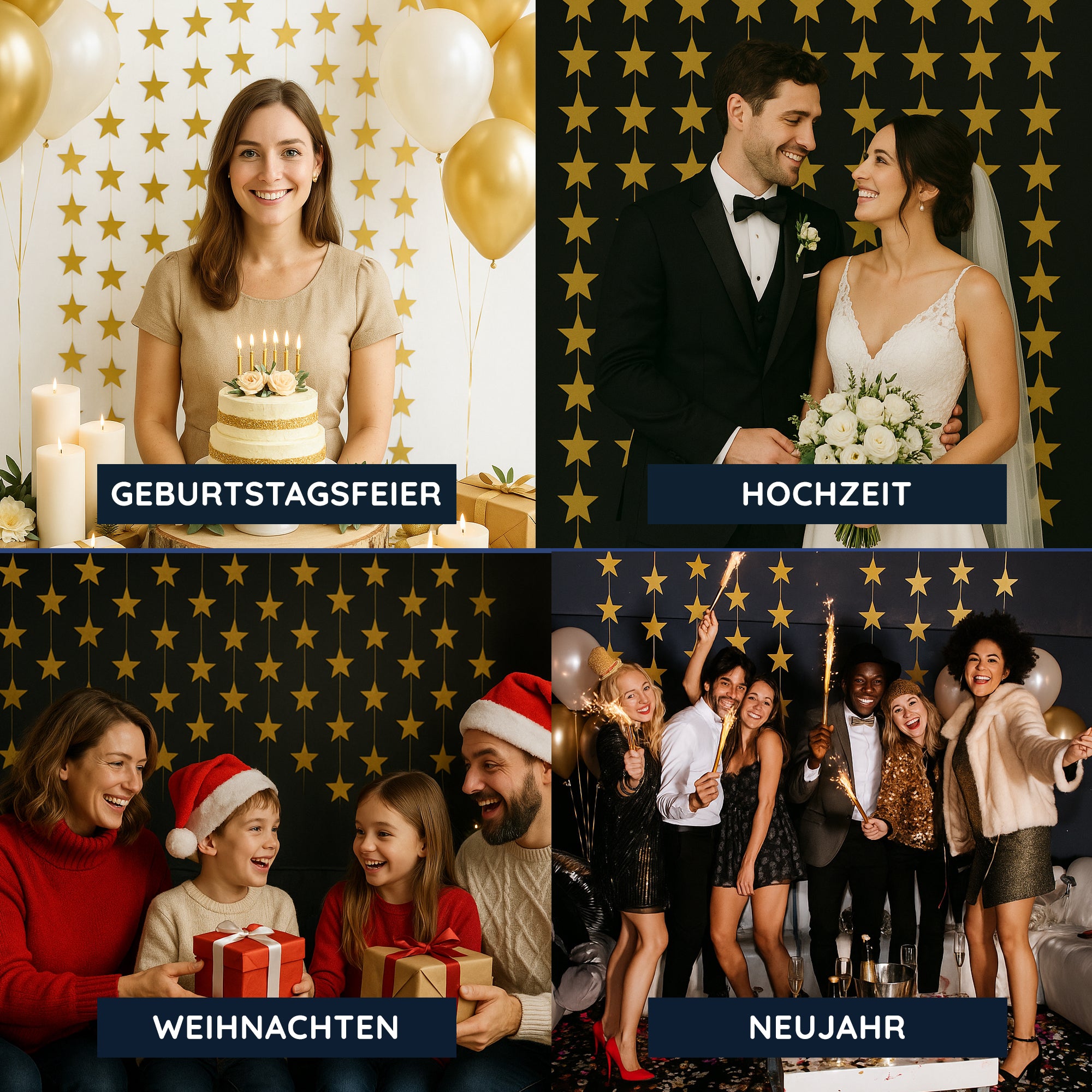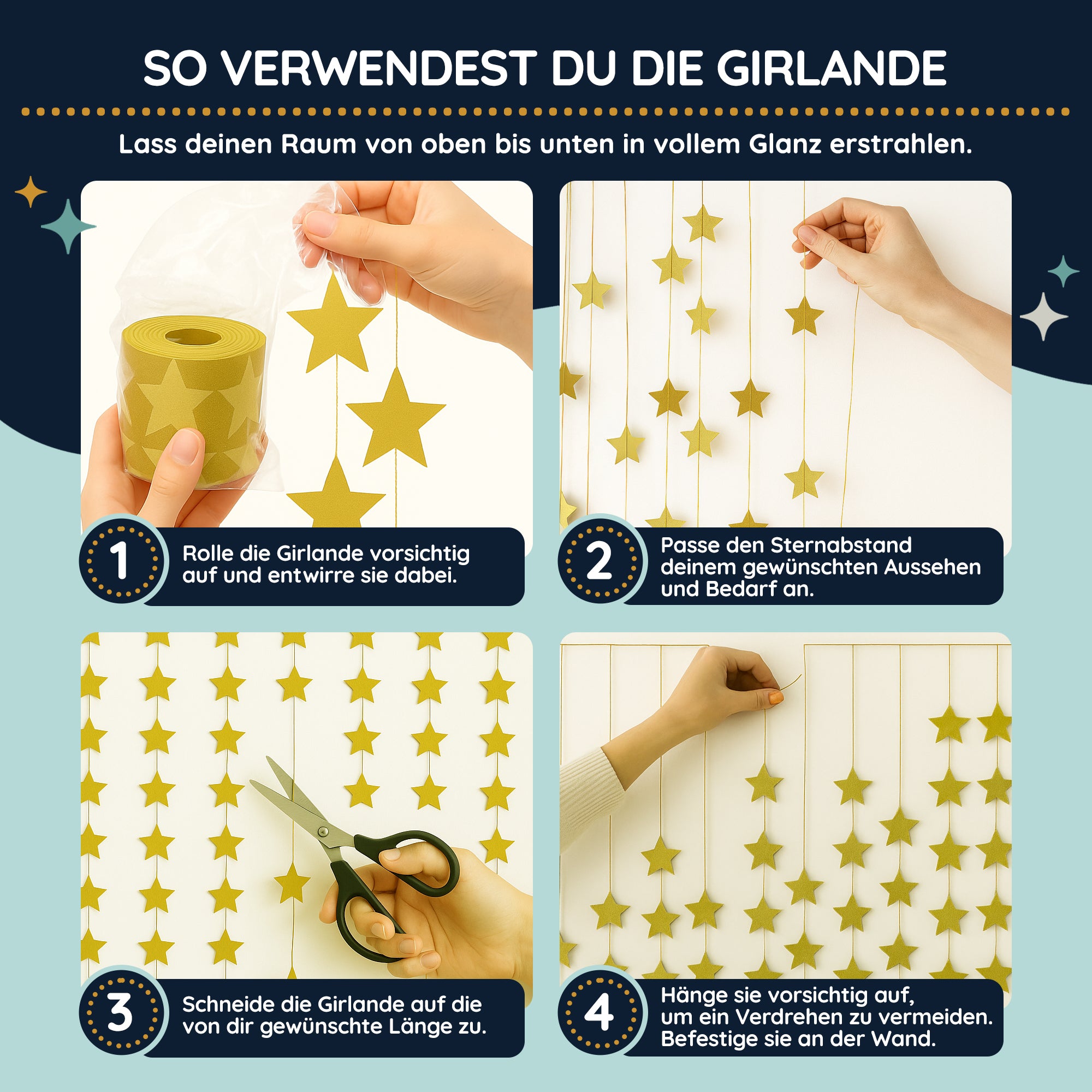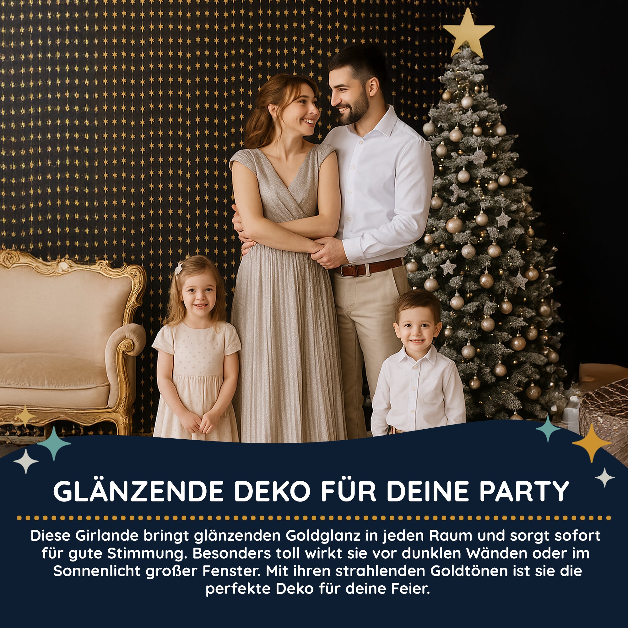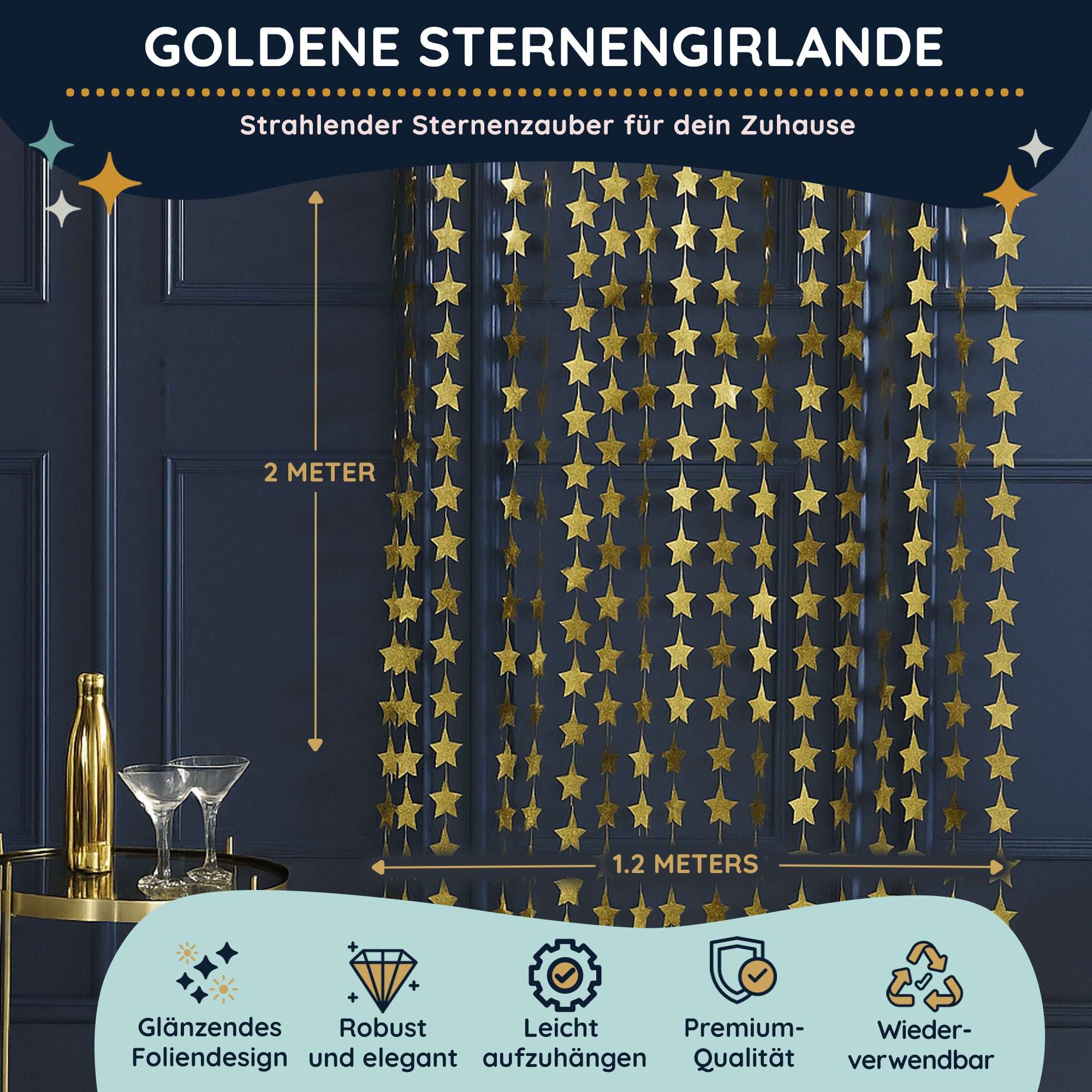 Dieser wunderschöne Goldene Sternen-Wandbehang ist wie ein Sternenregen bei dir zu Hause. Besonders auffällig und elegant wirkt dieser Goldregen vor einem dunklen Hintergrund, aber auch an einem bodentiefen Fenster. Da der Wandbehang 1,2m breit und 2m lang ist, fällt er durch sein stetiges Funkeln besonderes ins Auge. Gerade an Weihnachten oder Silvester hast du damit ein tolles Highlight gesetzt.