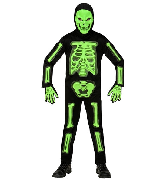 Dieser 3D Overall Skelett besteht aus einem Jumpsuit, einer Maske mit Kapuze und Handschuhen. Das Kostüm ist versehen mit neon grünen Skelettteilen in 3D Optik. Das macht dieses Kostüm zu Halloween zu einem echten Blickfang.