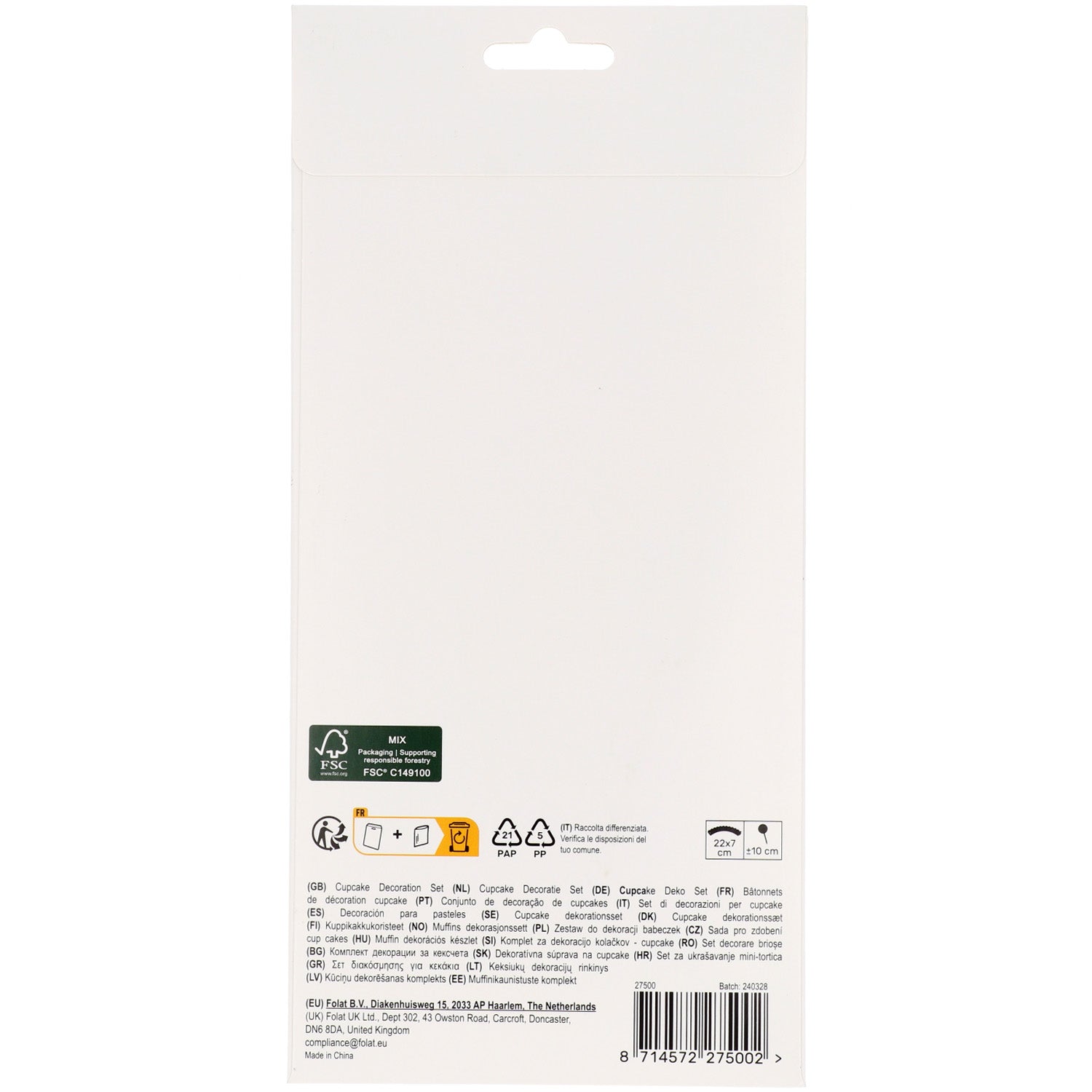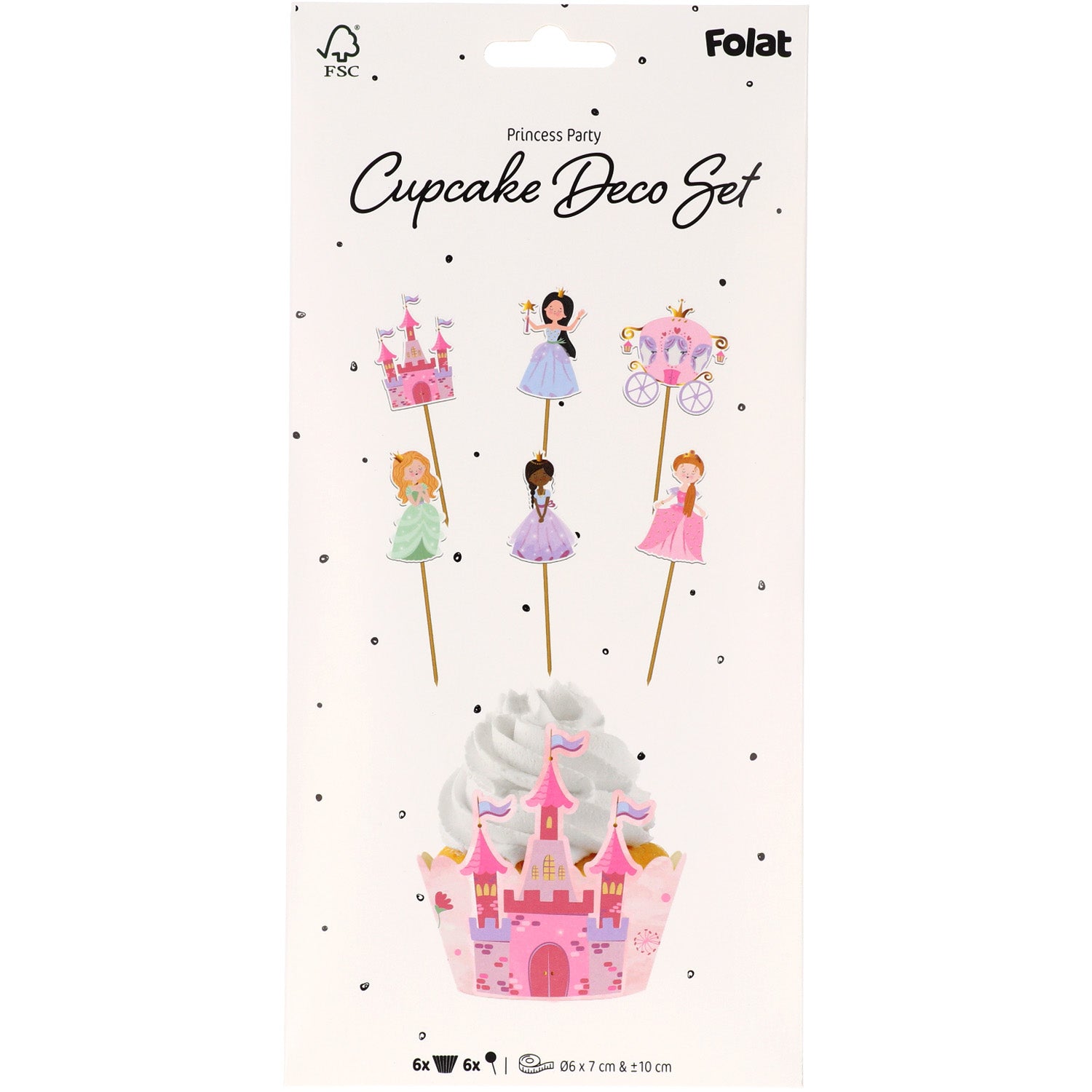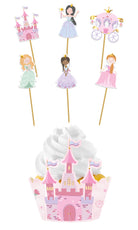 Im Lieferumfang sind insgesamt 6 Pretty Princess Cupcake Topper mit 10cm Länge sowie 6 Banderolen enthalten. Die Motive zeigen Prinzessinnen, einer Kutsche und ein Schloss sowie 6 ca. 22,5 cm lange und 5 cm hohe rosafarbene Wrapper mit einem Märchenschloss oben drauf.
