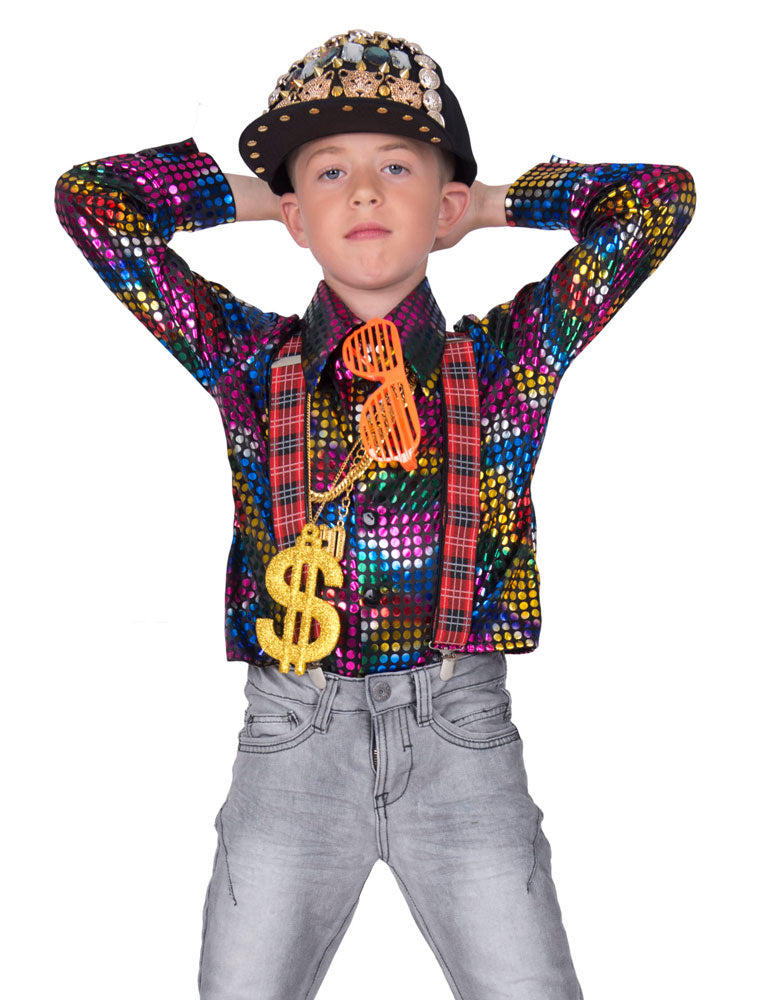 Unser 80er Jahre Disco Boy Jungenkostüm eignet sich hervorragend für Karneval oder Fasching. Das bunt metallisch schillernde Hemd lässt sich super mit diversen schrillen Accessoires kombinieren, wie beispielsweise einer Sonnenbrille, Glitzerketten und Hosenträgern.