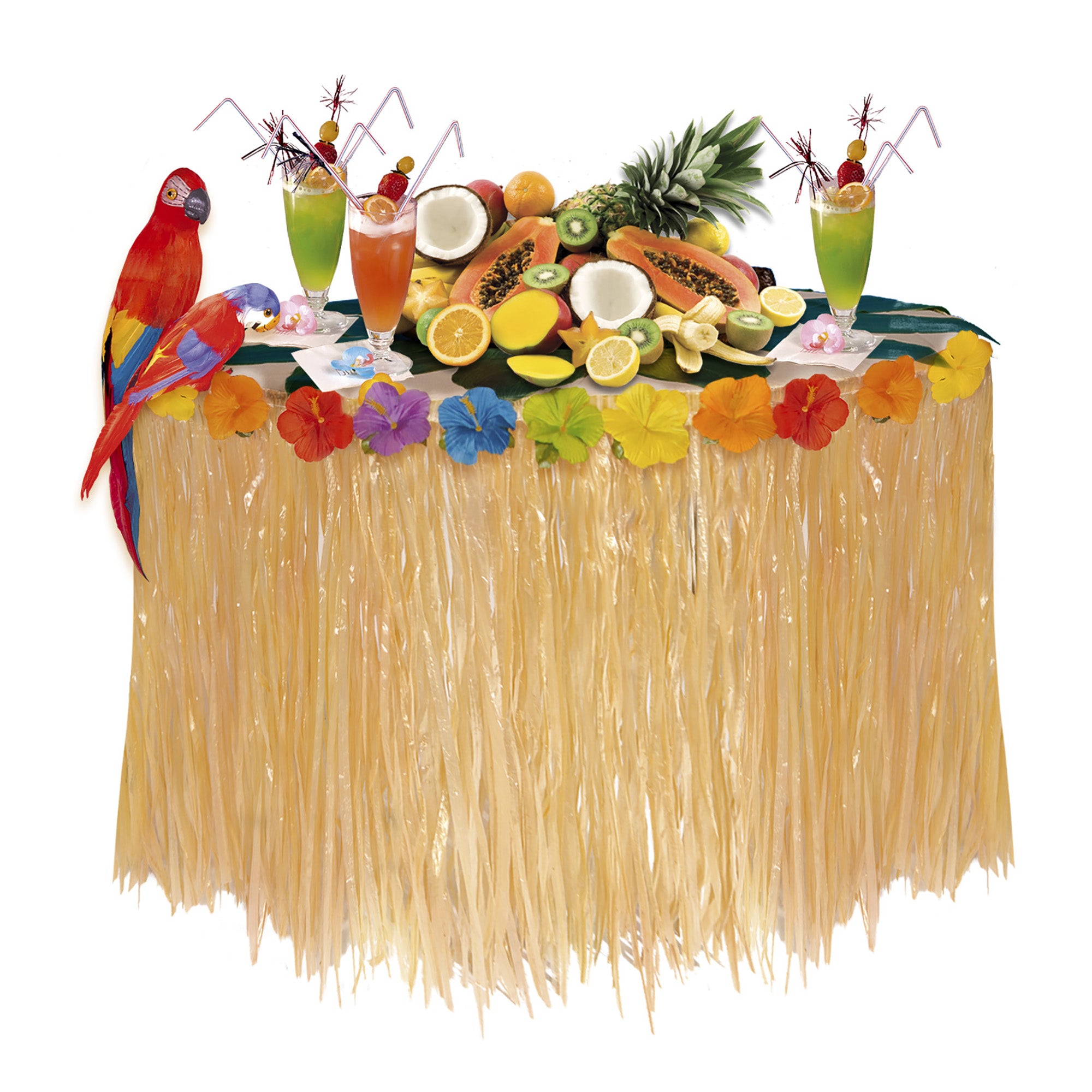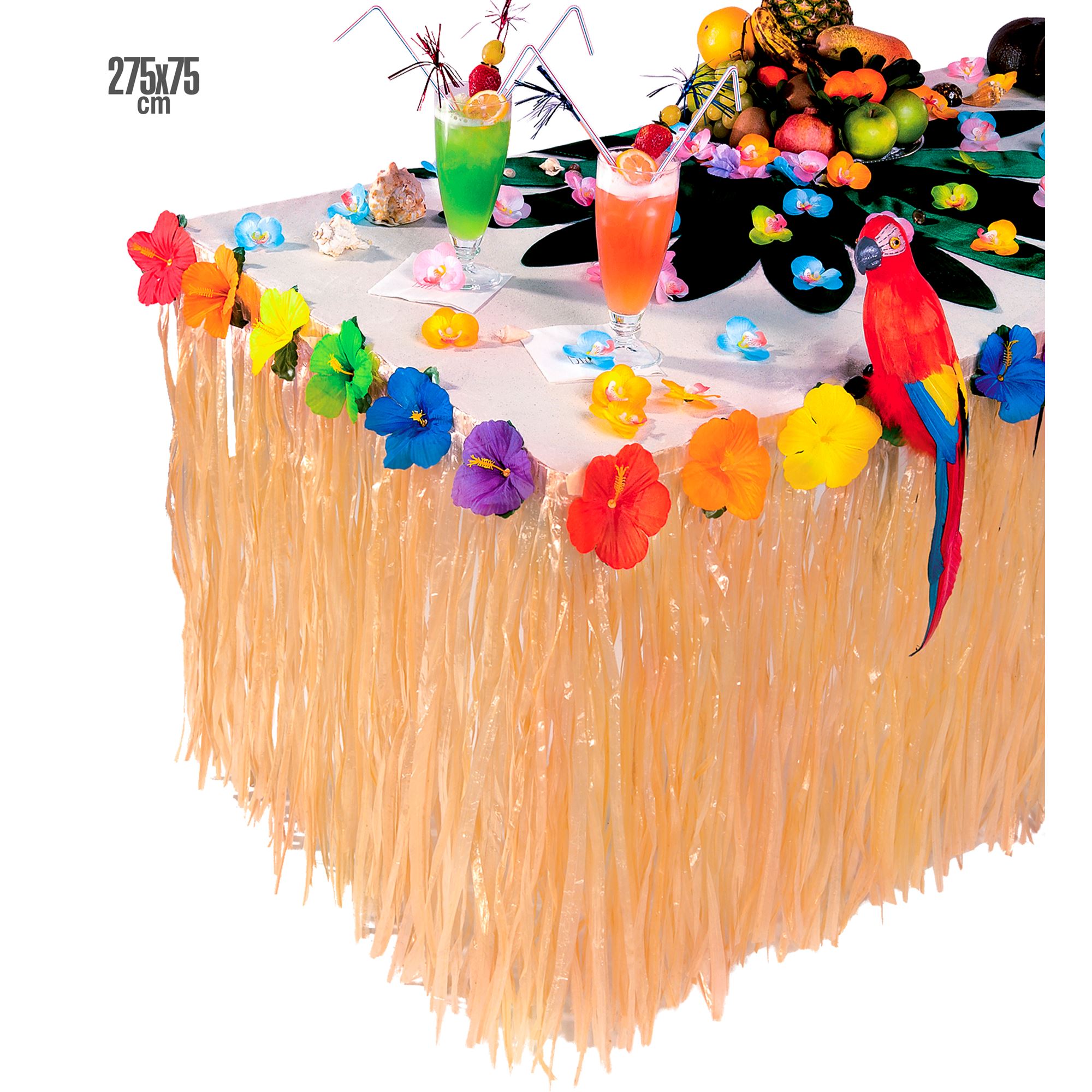 Mit diesem bunten Tischrock Südsee Style verwandelst du deine Party Location im Handumdrehen in ein Südsee- Paradies. Der Rand des Rocks ist mit wunderschönen, bunten Hibiskusblüten verziert. Er ist 2,75m x 75cm gross, besteht aus Polyester und kaschiert gekonnt deine Tischbeine.