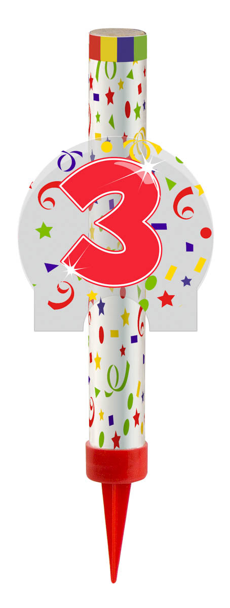 Ob zum 3. Geburtstag oder in Kombination mit einer weiteren Zahl, die Eis- und Tortenfontäne Zahl 3 mit einer Höhe von 12cm ist das Highlight auf der Geburtstagstorte. Für etwa 45 Sekunden versprüht sie ihre Funken und bringt den Raum zum leuchten.