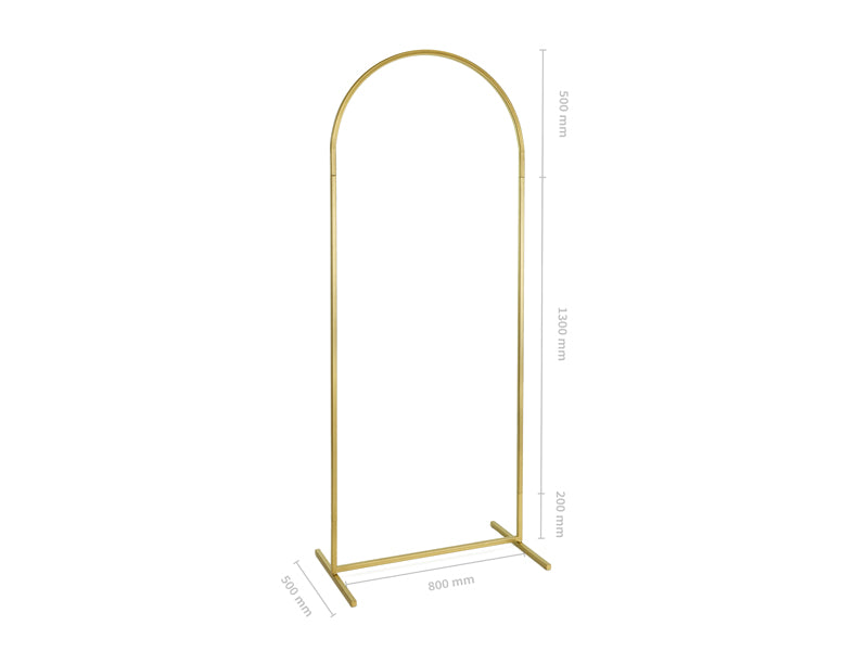 Hintergrundständer in Form eines Bogens, aus Stahl in goldener Farbe, Breite im zusammengeklappten Zustand 80 cm, Höhe 200 cm. Leicht zu montierendes Produkt, das nach dem Zusammenklappen eine stabile Struktur bildet. Geeignet für mehrfachen Gebrauch, ideal für professionelle Anwendungen. Der Ständer besteht aus 6 Elementen. Anzahl der Elemente im Karton: 6 Ständerteile, 6 Schrauben für die Montage, 1 Inbusschlüssel und Anleitung. Abmessungen des Kartons: 138x53x8cm. Die genauen Maße des Ständers sind in der Grafik unter dem Produktfoto angegeben.