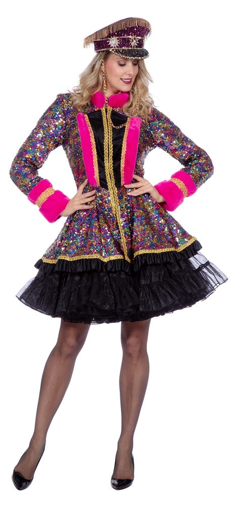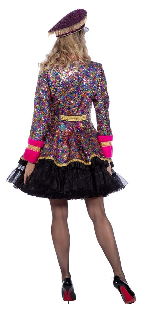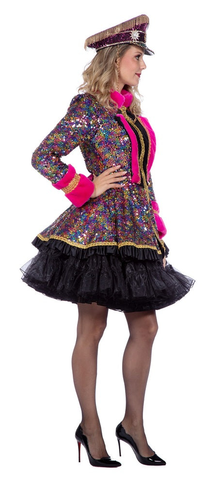 Diese mehrfarbige Damen-Kostümjacke ist ein echter Hingucker für alle, die auf der Bühne oder beim Karneval glänzen wollen. Die funkelnden Pailletten in Regenbogenfarben reflektieren das Licht bei jeder Bewegung und setzen dich eindrucksvoll in Szene. Auffällige pinke Plüschbesätze und goldene Zierborten sorgen für einen stilvollen Kontrast und verleihen dem Kostüm eine besonders luxuriöse Ausstrahlung. Die taillierte Form betont gekonnt die Figur. Ob für den großen Auftritt beim Straßenkarneval, die Showgruppe oder einfach ein auffälliges Partyoutfit, diese Jacke begeistert mit Stil und Glanz.