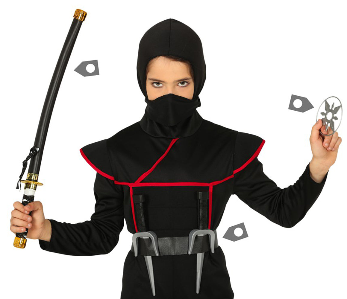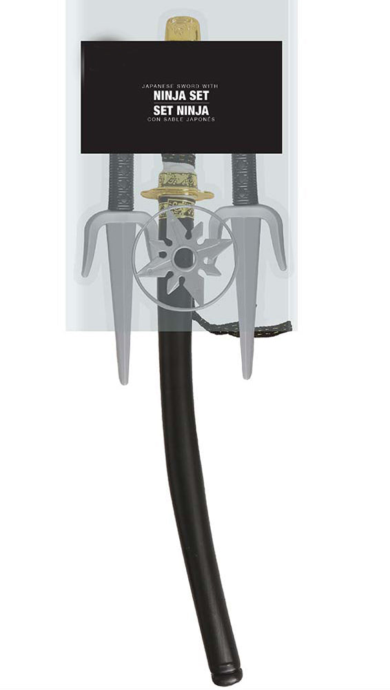 Das Ninja Zubehör-Set 4teilig für Kinder besteht aus 2 Saigabeln, einem Wurfstern sowie dem japanischen Säbel.