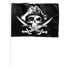 Die Piraten Totenschädel Fahne ist unerlässlich für kleine und große Piraten die eine Party feiern wollen. Die Fahne hat das klassische Totenkopf-Symbol mit Augenklappe und gekreuzten Knochen auf schwarzem Hintergrund. Befestigt ist die Fahne an einem weißen Stock. Somit lässt sich die Fahne leicht an Möbeln fixieren, in die Erde stecken oder in der Hand schwenken. Insgesamt ist Piratenfahne 43 x 30cm groß.