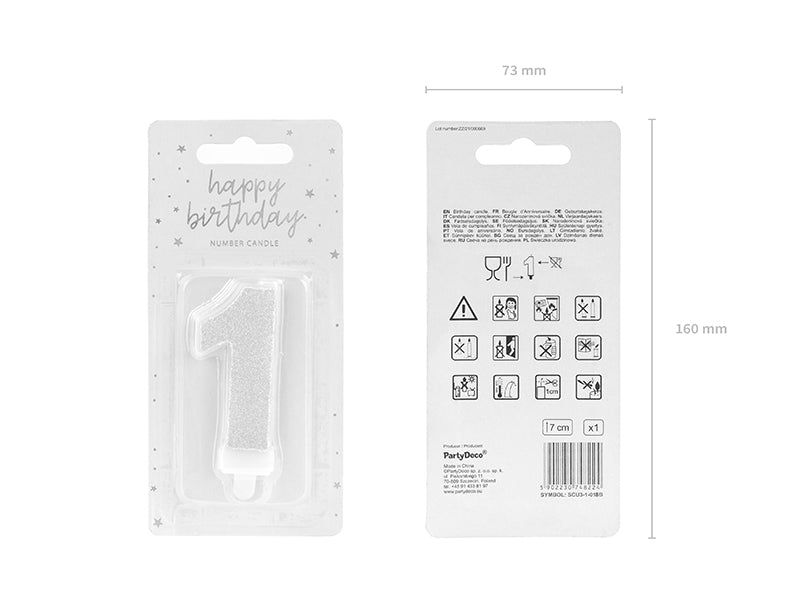 Die Silberschimmer Tortenkerze 1 verleiht einem klassischen Geburtstagskuchen den letzten Touch. Die silberne Kerze glänzt im Licht ihrer Flamme und ist mit einer Größe von 7cm von überall gut sehbar.