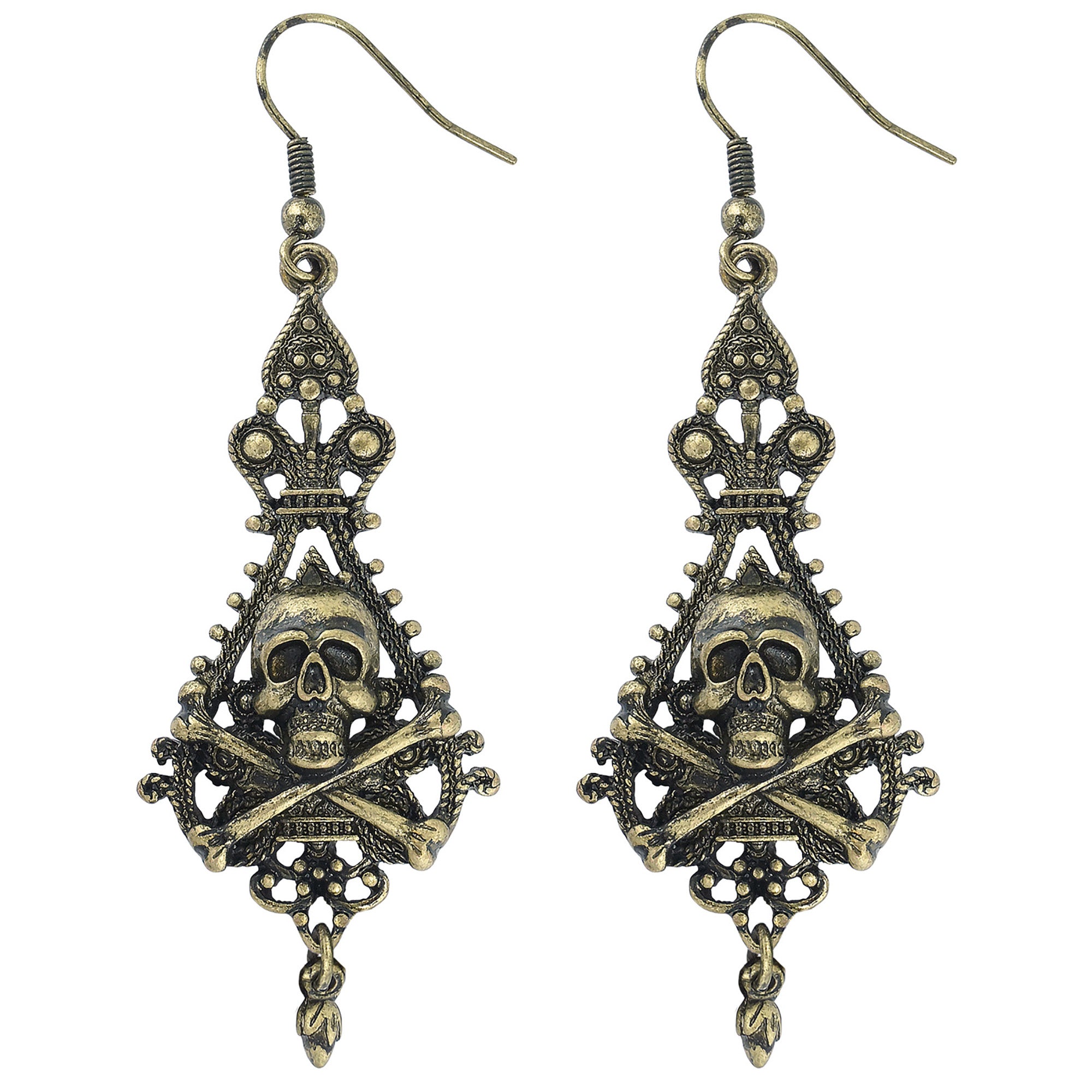 Du gehst als Piratin zur Mottoparty oder zum Karneval und suchst noch das passende Accessoire? Dann sind diese Totenkopf Hängeohrringe im Piratenlook genau richtig. Die bronzefarbenen Ohrringe sind mit einem Totenkopf und gekreuzten Knochen gestaltet.