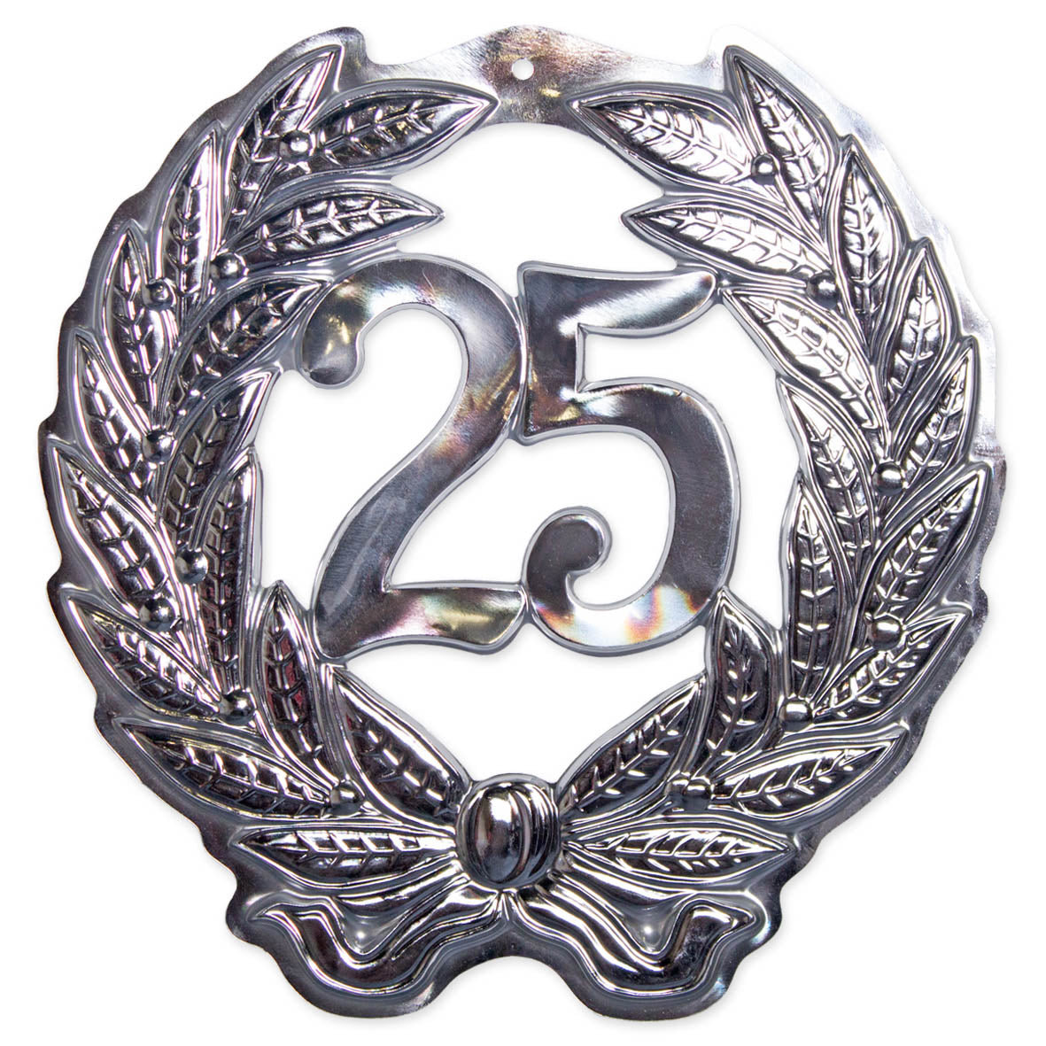 Eine Türdeko zur Silberhochzeit mit den Maßen 45 x 42cm aus Kunststoff ist eine ideale Wahl, um das Haus oder die Feierlokalität für diesen besonderen Anlass zu schmücken. Die silberne Zahl 25 steht dabei im Mittelpunkt und symbolisiert die 25 Jahre, die das Paar gemeinsam verbracht hat.