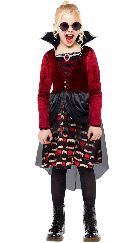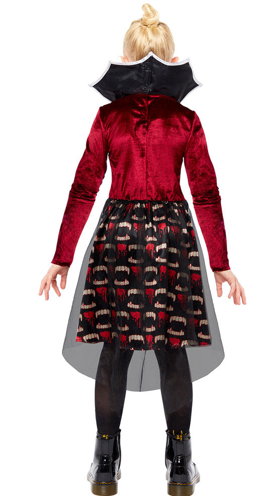 Hübsch gruselig verkleidet zur Halloweenparty mit dem Vampir Prinzessin Ella Mädchenkostüm! Das Kostüm besteht aus einem rubinroten Kleid mit Kragen und schwarzem Tüllrock.