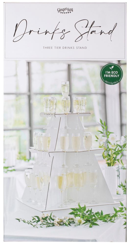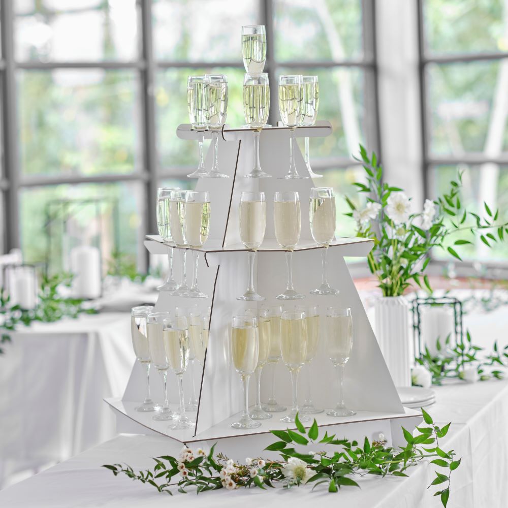 Die Weiße XL Getränkepyramide lädt zum Anstoßen ein! Dieser extragroße Ständer aus Pappe mit einer Höhe von 79cm sieht auf einem eigenen Tisch, an dem sich die Gäste bedienen können, einfach fantastisch aus.