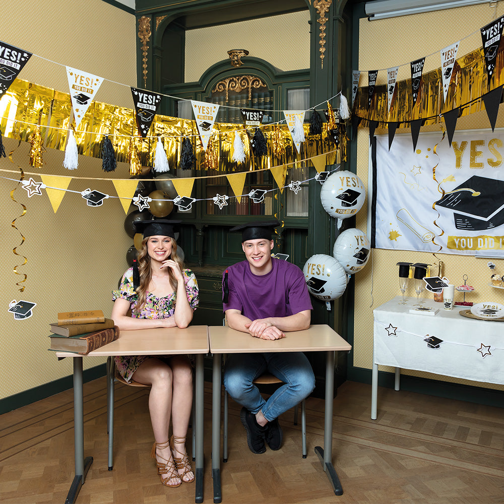 Dekoriere deine Abschlussfeier mit der Wimpelkette Graduation Glam und schaffe eine festliche Atmosphäre. Ihre Fahnen von 30 cm Höhe und 20 cm Breite auf einer Länge von 6 Metern bringen Glanz in jeden besonderen Moment.