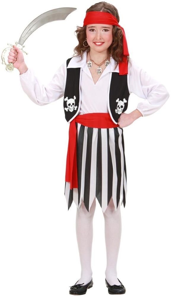 Für spannende Abenteuer und große Schatzsuchen ist das 'Trixi die Piratentochter Mädchenkostüm' die perfekte Outfitwahl. Im Lieferumfang enthalten ist der schwarz-weiß gestreifte Rock, der rote Gürtel, das weiße langärmlige Piratenhemd, die Weste mit den Totenkopfaufdrucken und das rote Stirnband.