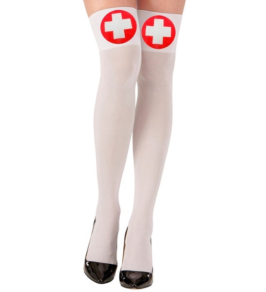 Diese weiß-rote Krankenschwester Strümpfe sind ein beliebtes Accessoire für diverse Anlässe! Die halterlosen Strümpfe in Einheitsgröße komplementieren dein sexy Krankenschwester-Outfit.