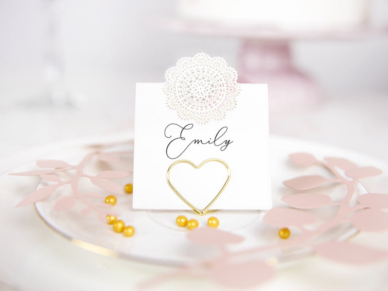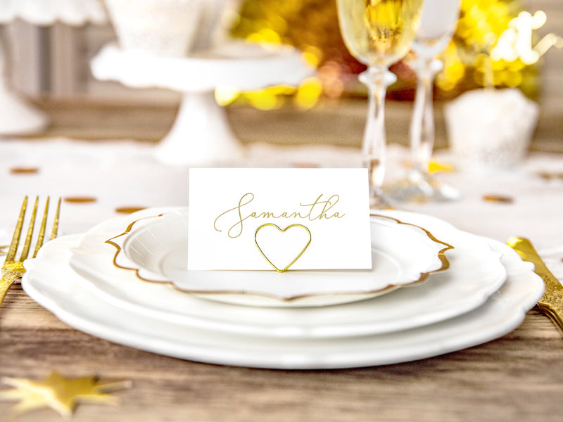 Die 10 Herzilein Kartenhalter in Gold sind eine wunderschöne Option, um deinen Gästen zu zeigen, wo sie sitzen! Die Kartenhalter sind 2,5cm groß und in hübscher Herz-Form und edlem Gold gehalten und daher ideal für Hochzeiten und große Jahrestag-Feiern geeignet. Mit goldener Tischdeko kannst du deine Hochzeit liebevoll so richtig schick und edel aufziehen!
