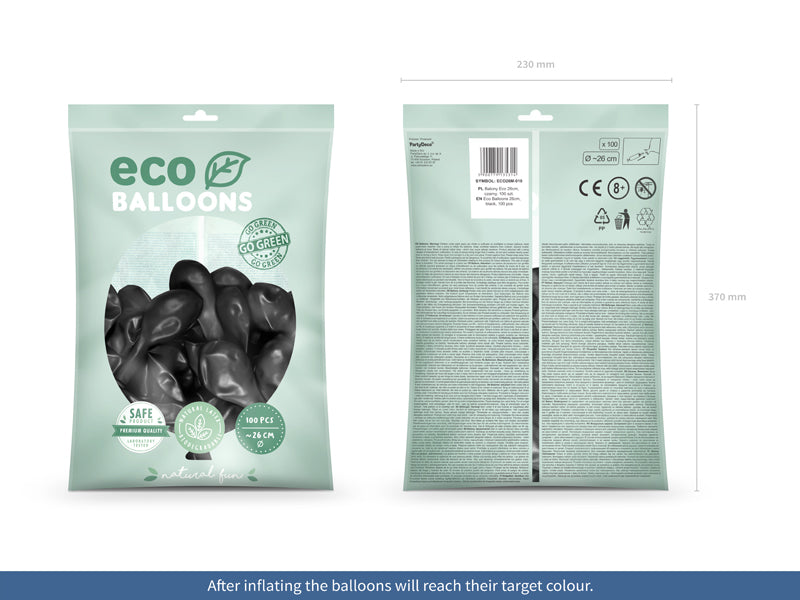 Die 100 Eco metallic Ballons in Schwarz sind aus natürlichem Latex vom Kautschukbaum gefertigt. Sie überzeugen durch ihre biologische Abbaubarkeit, die dem Kompostierungsprozess von Blättern gleicht. Für die Verpackung wurden ausschließlich natürliche Farben verwendet. Sie besteht aus sicherem Kunststoff und kann recycelt werden. Ein Ballon ist 26cm groß.
