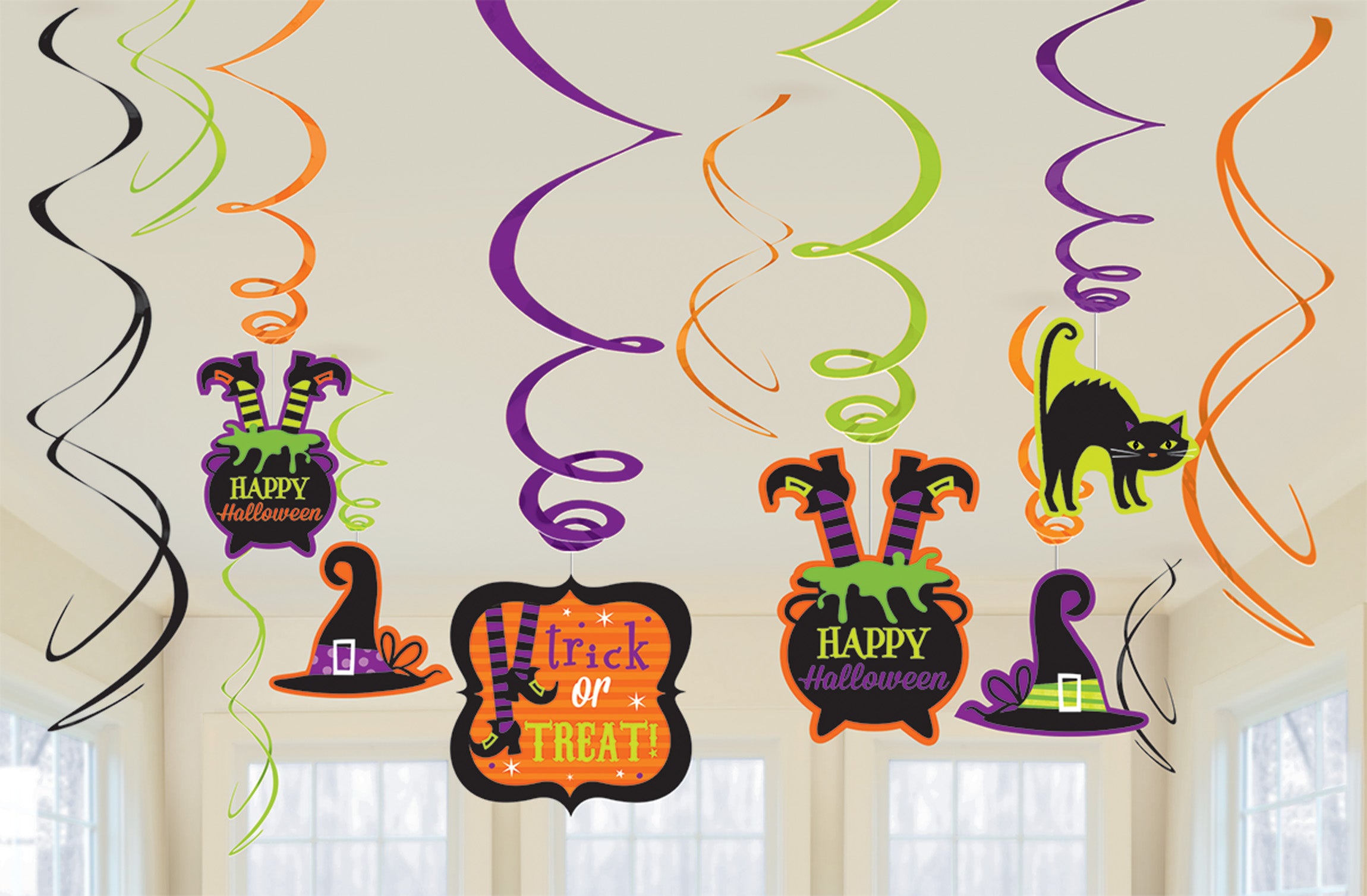Dieses 12-teilige Hexencrew Deko-Set beinhaltet eine Auswahl an Dekoration zum Aufhängen. 6 Wirbel aus Folie und 6 mit einem bebilderten Halloween-Ausschnitt.