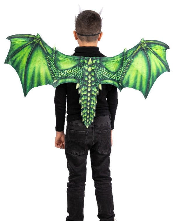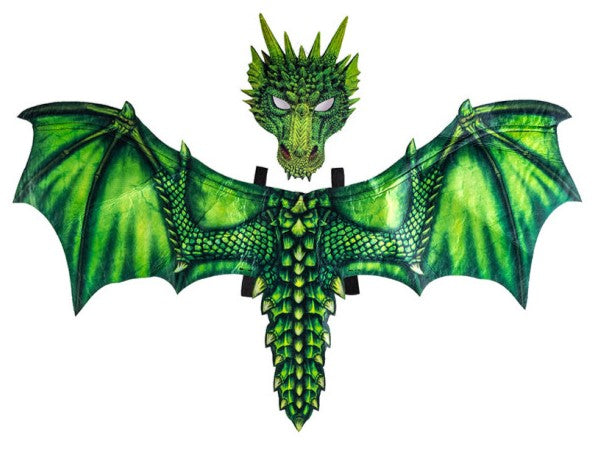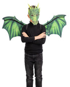 Dieses 2- teilige Verkleidungsset Grüner Drache besteht aus Flügeln, welche eine Größe von 96 cm hoch x 60 cm messen sowie der dazu gehörigen Maske.