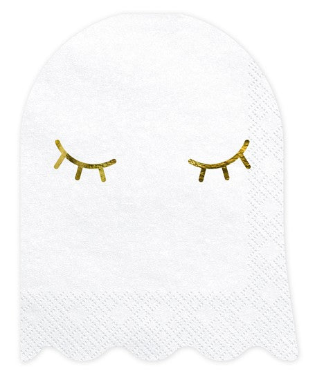 Diese Geisterchen sind nur bedingt angsteinflößend. Trotzdem ergänzen die 20 Boo Town Geist Servietten jede Halloween-Tischdeko hervorragend. Auf 11 x 14cm sind geschlossene Augen in einem schönen Gold-Metallic aufgedruckt.