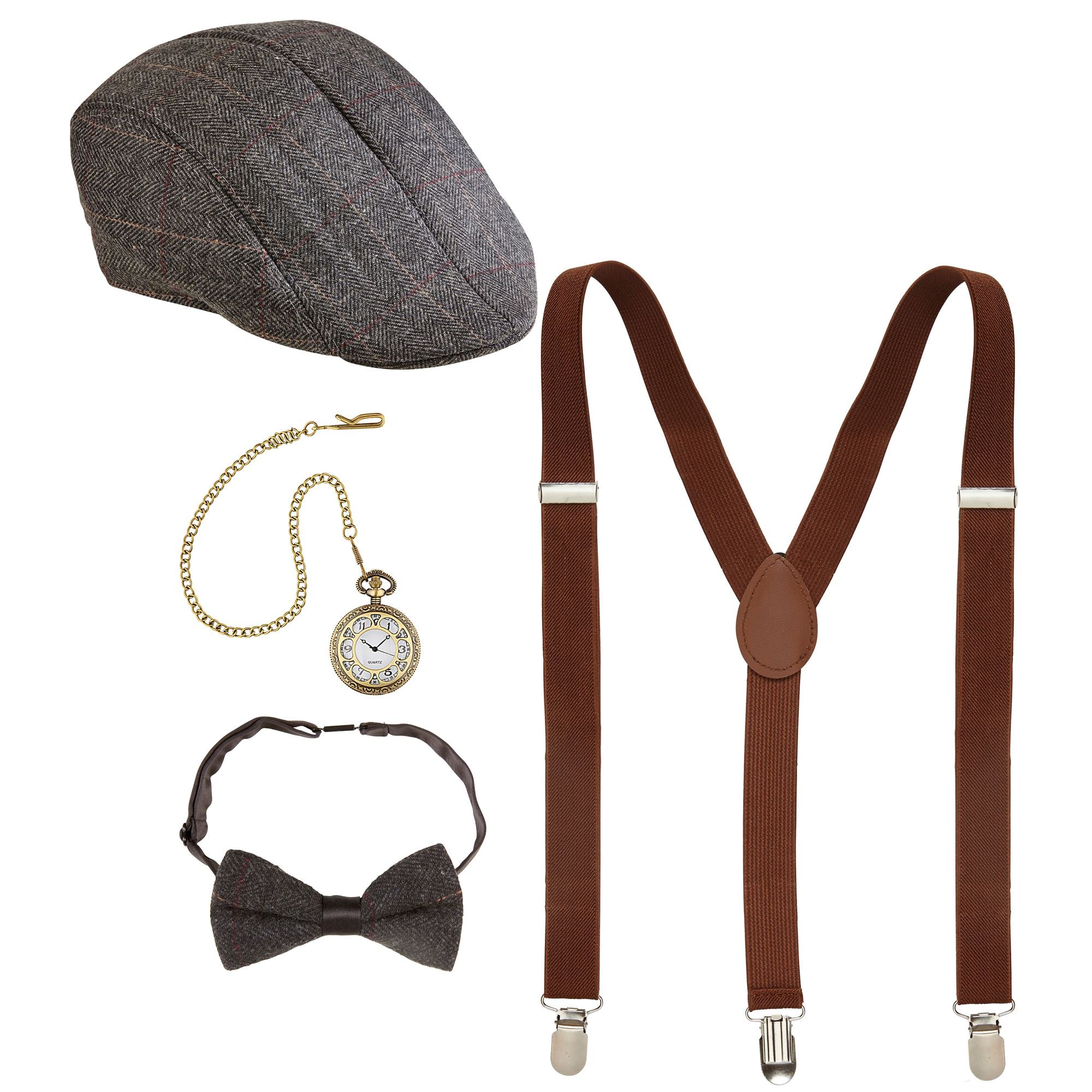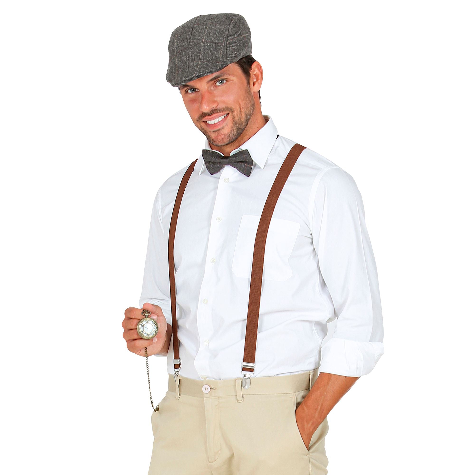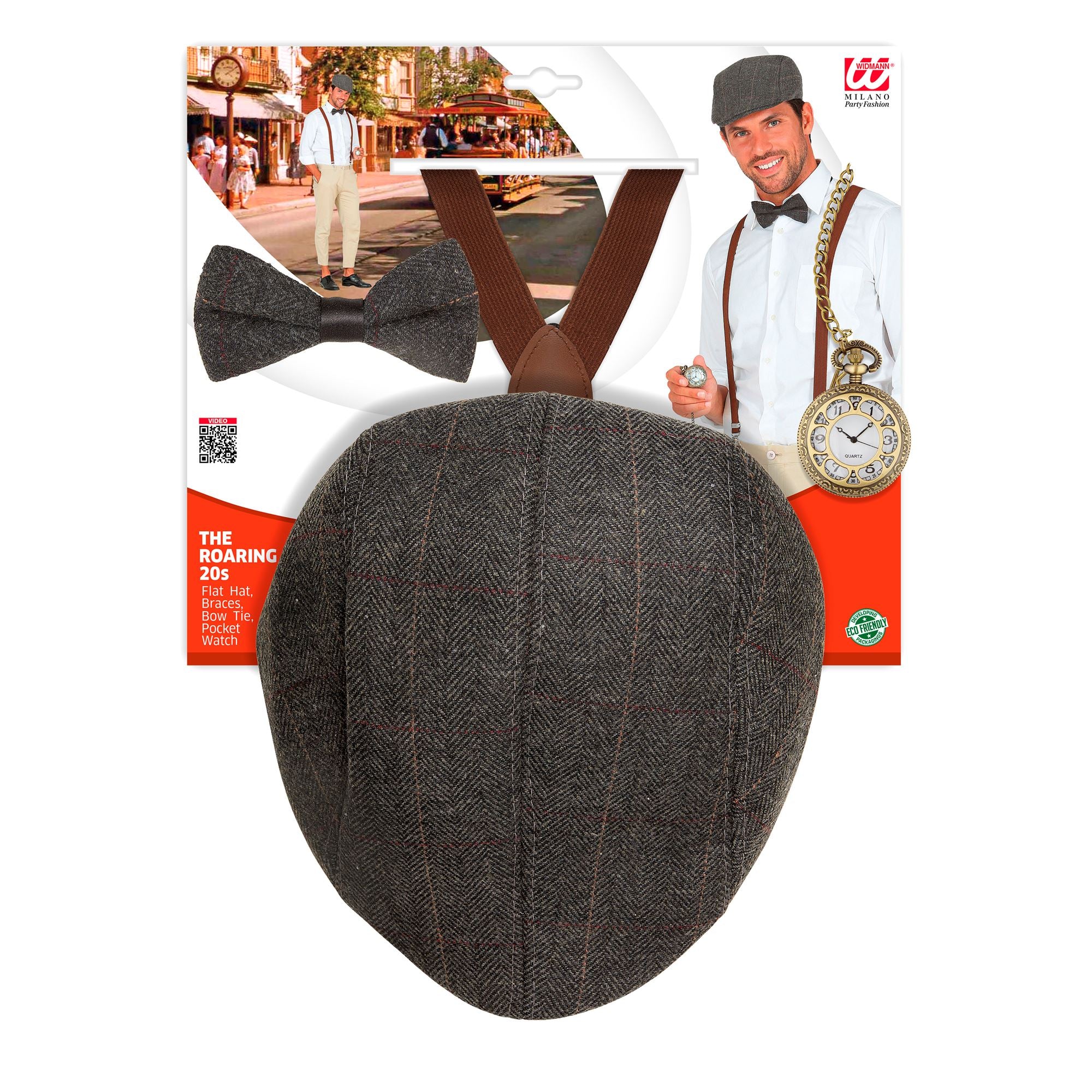 Mit dem 20er Jahre Zubehör Set 4-teilig bist du bestens ausgestattet für die kommende 20er Jahre - oder eine Peaky Blinders Party! Zum Set gehören eine Schiebermütze, eine Taschenuhr, Hosenträger sowie eine Fliege.