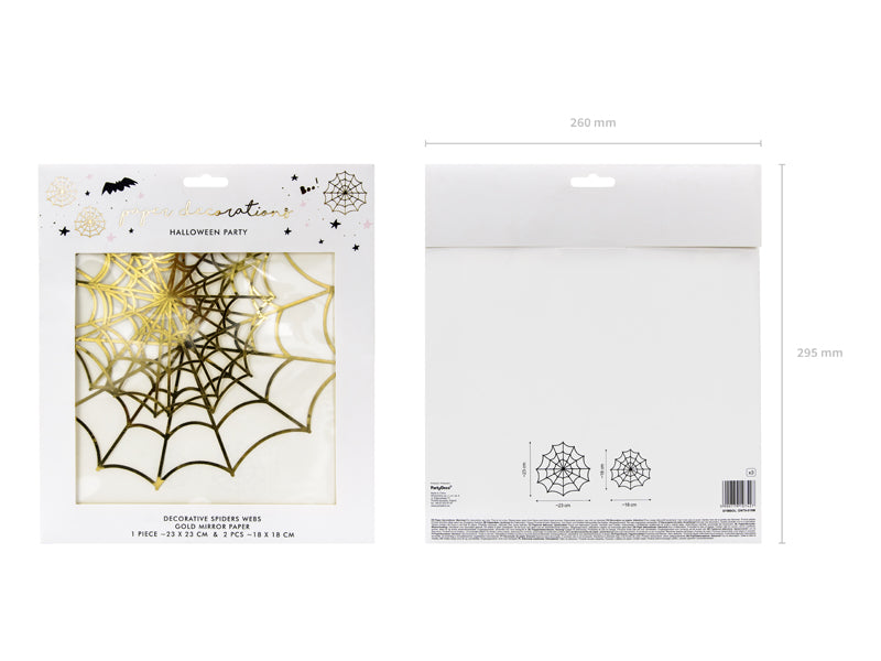 Diese Be Scary Spinnweben Deko will niemand wegsaugen! Die drei unterschiedlich großen Spinnweben aus Pappe ergänzen jede schaurige Deko durch ihre goldene Metallic-Optik. Egal, ob du sie aufhängen oder liegend als Tischdeko verwenden möchtest - die drei Spinnennetze werten alles durch ihre glanzvolle Eleganz auf. Das größere Spinnennetz misst 23 x 23cm, während die beiden kleineren 18 x 18cm messen.