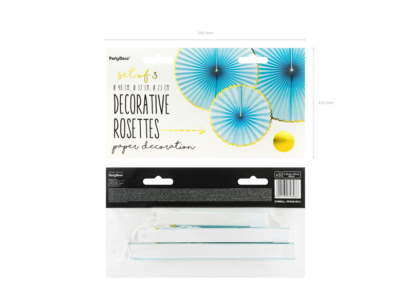 Diese tollen 3 Candy Party Papierrosetten in Pastellblau sind ideal für eine romantische und edle Partydekoration. Die Rosetten in schönen hellblauen Pastelltönen haben einen roségoldenen Rand. Die 3 hübschen Deko-Artikel haben die Größe von 40cm, 32cm und 23cm und werden dir mit Aufhängern geliefert.