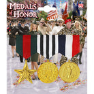 Endlich gibt es sie: Ehrenmedaillen, die man nicht nur für militärische Ehren verleihen kann. An der Nadel befinden sich zwei runde sowie eine sternförmige Medaille. Die Nadel ist ca. 8cm breit, aus Kunststoff und ist die perfekte Ergänzung für dein Militär-, Piloten- oder Marine-Kostüm.