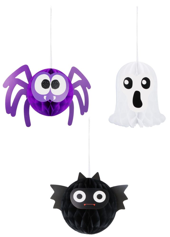 Mit diesen 3 Gruselnacht Wabenfiguren – Geist, Spinne und Fledermaus – wird jede Halloweenparty zum echten Hingucker. Die bunten Papier-Waben lassen sich leicht auffalten und sorgen im Handumdrehen für eine gruselig-gemütliche Atmosphäre.