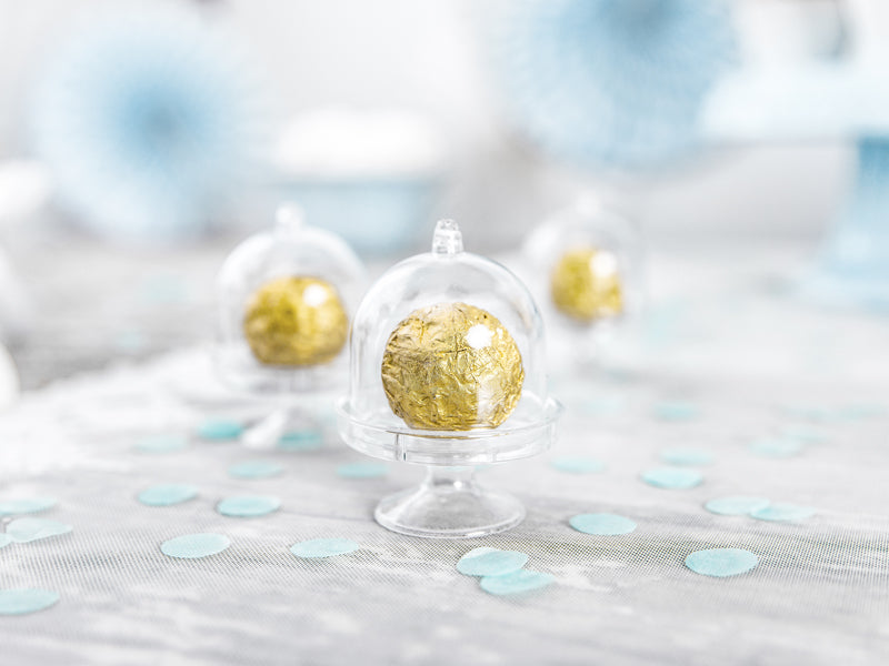 Der Tortenständer Sweets in der Größe 5,5 x 7,5cm eignet sich ideal, um kleine Präsente ins rechte Licht zu rücken. Ein paar Pralinen, etwas selbst Gebackenes oder eine hübsche Christbaumkugel entwickeln unter der durchsichtigen Kuppel gleich eine faszinierende, schillernde Wirkung. Auch auf deinem Kaffeetisch machen sich die Leckereien hervorragend und sie vor vorschnellen Zugriffen geschützt.