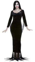Wer liebt sie nicht - die Addams Family? Morticia, die finster vampiristische Frau, zeichnet sich durch ihren exzentrisch Stil aus. Denn sie trägt immer lange, schwarze, enganliegende Kleider zu ihrem ebenfalls langem, schwarzen Haar und dem typisch roten Lippenstift. Dieses Addams Family Morticia Kostüm für Damen besteht aus einem figurbetonten Kleid mit Schleiern, die von den Ärmeln herab hängen. Außerdem ist die Perücke dabei, die deine Verwandlung in Morticia Addams vollendet.