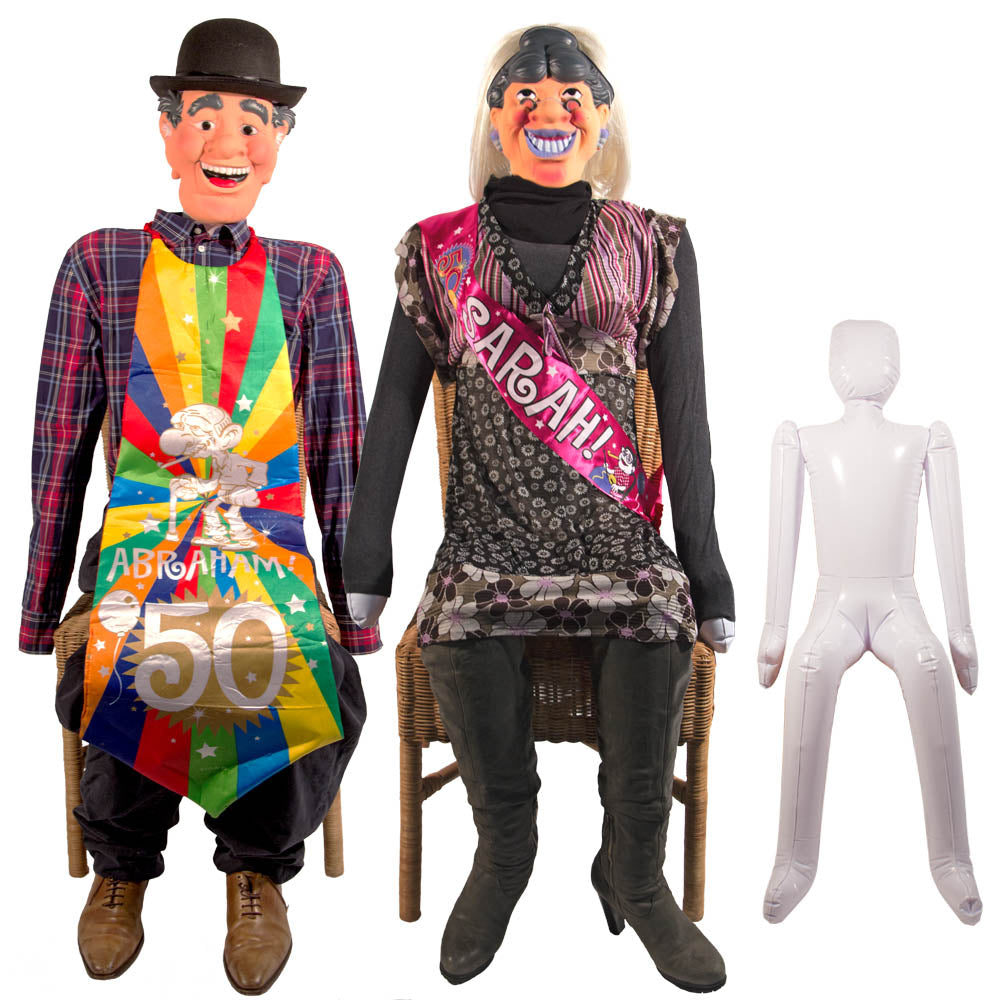 Ein halbes Jahrhundert Lebenserfahrung muss ordentlich gefeiert werden! Ganz nach holländischer Tradition bekommen die Männer eine Abraham und die Frauen eine Sarah Puppe geschenkt. Unsere aufblasbare Abraham und Sarah Puppe kannst du ganz nach deinen eigenen Wünschen gestalten. Sie ist komplett weiß und kann mit Kleidung, Schärpen, Krawatten und Masken geschmückt werden. Die auf dem Bild dargestellten Puppen sind lediglich Dekobeispiele und sind nicht mit im Lieferumfang enthalten. Insgesamt hat die Puppe eine Größe von 1,3m.